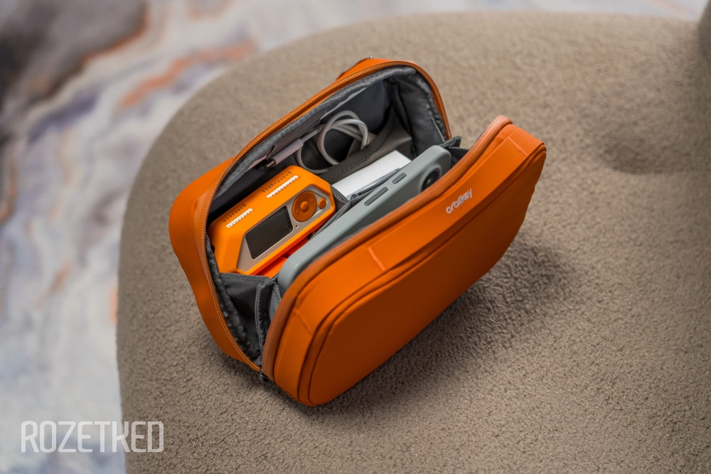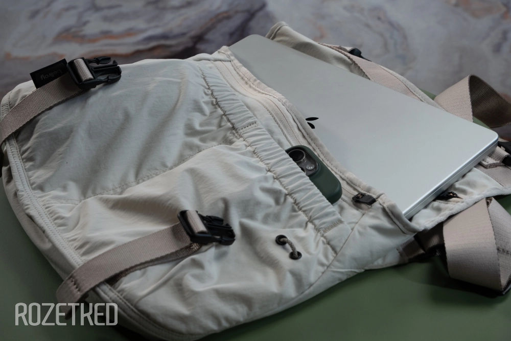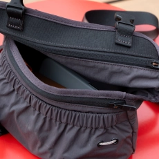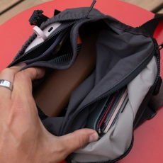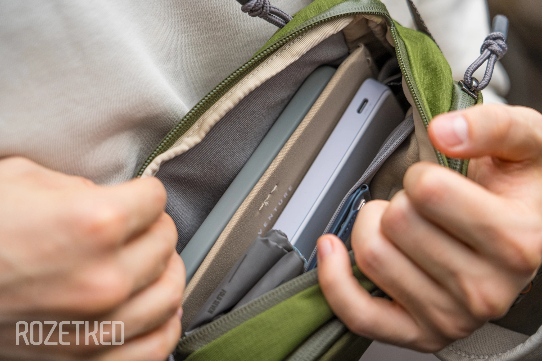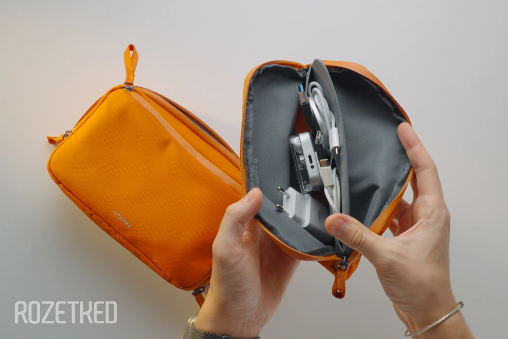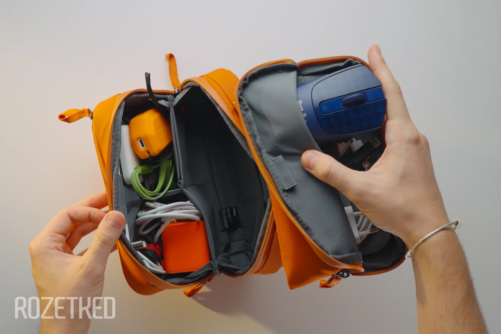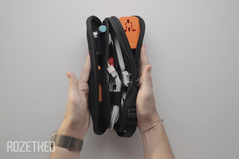 В сумке помещаются даже большие адаптеры зарядки от MacBook, не говоря уже о кабелях и небольших предметах. Если носить только мелочёвку, то это хорошая сумка на каждый день, которая занимает мало места. Если хранить что-то побольше, то вариант уже менее удобный из-за не самого быстрого доступа к содержимому.