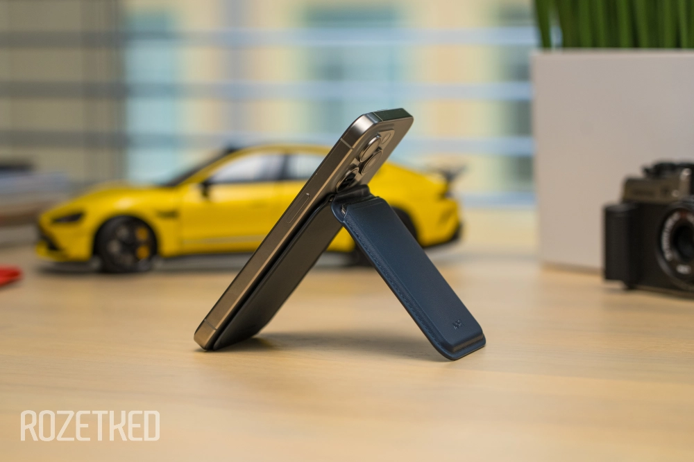 Flash Wallet and Stand — вариант более толстый, зато у него регулируется наклон подставки, с помощью раскладывающейся конструкции. Вмещает 3 карты, а внутри есть вырезанное окошко, чтобы, например, положить туда пропуск и показывать не доставая. Сделана из искусственной кожи, стоит примерно тех же денег, что и предыдущая модель.