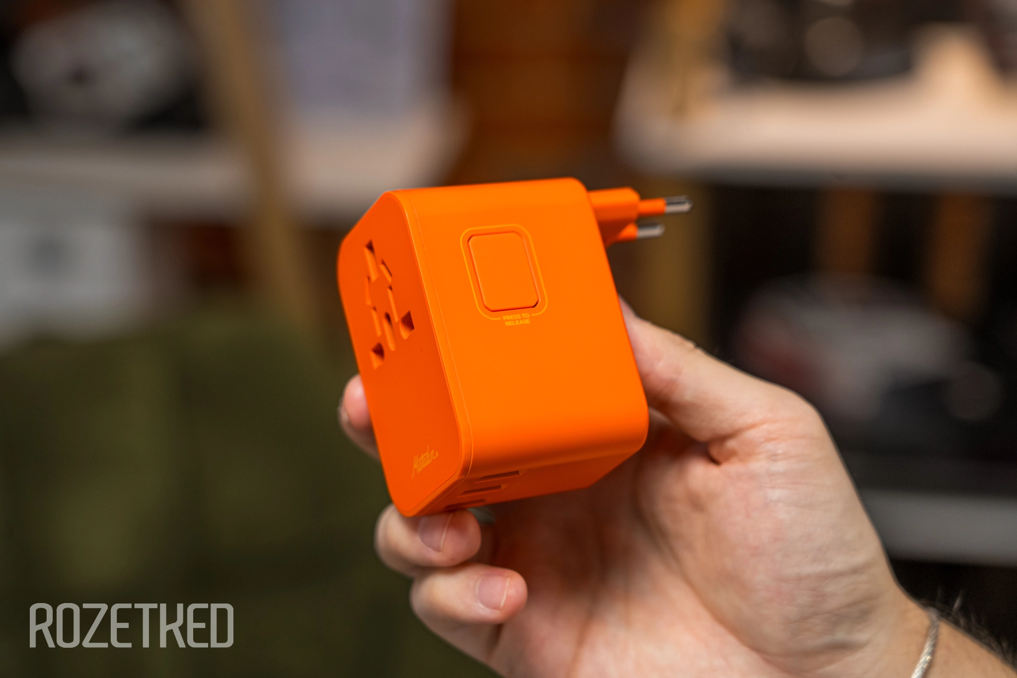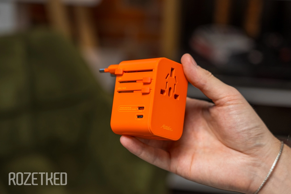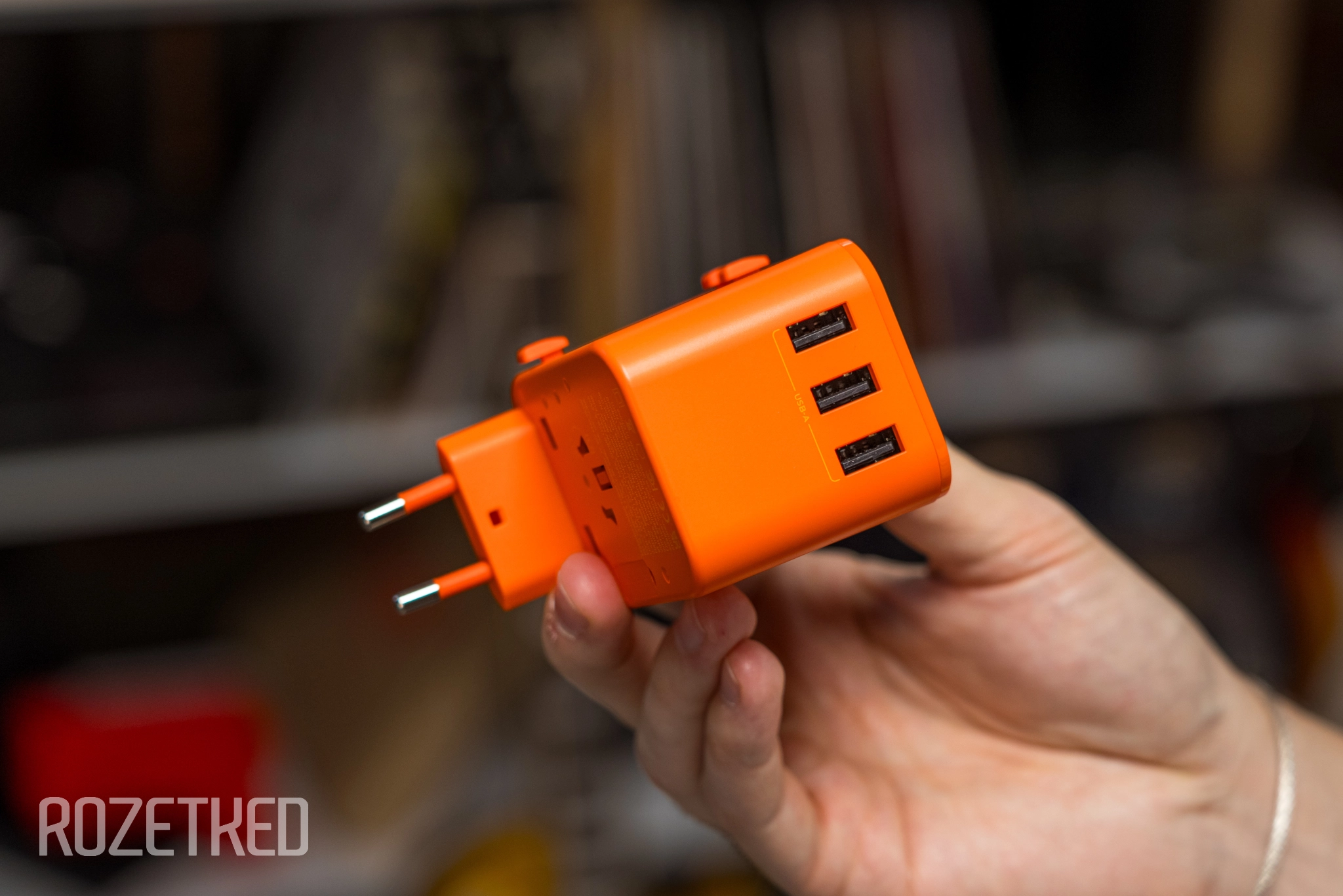 Есть всё нужное: 2 USB-C (один из них быстрый — до 35 Вт), 3 USB-A и универсальная розетка. Через него можно заряжать ноутбуки, смартфоны, планшеты, наушники, камеры, консоли, часы и другую электронику. Ноутбук лучше подключать либо к розетке адаптера, либо к быстрому USB-C. А вот фены, плойки и другие мощные приборы подойдут только если у них указано «двойное напряжение» — напряжение сам адаптер не преобразует.