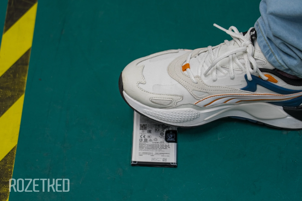 Но это всё в корпусе смартфона, а мы же пришли посмотреть на батарейку. Поэтому смотрим, как «мучают» её. Для начала аккумулятор кидают об бетон: мы лично проверили, кинули сами, попрыгали на нём — никаких видимых повреждений.