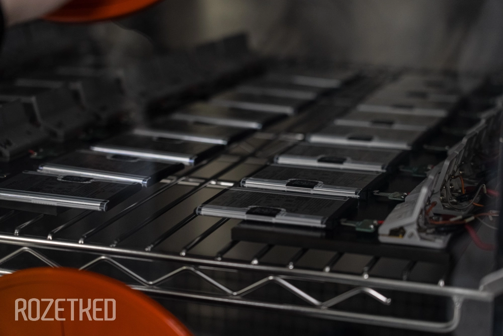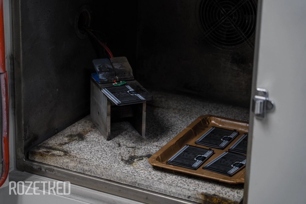 Наконец, нам продемонстрировали тест температурного шока. Несколько батарей поместили в камеры, где они циклически меняли температуру от -40 °С до +65 °С. Каждый цикл по шесть часов холода и жары. Как пояснил сотрудник лаборатории, это нужно для проверки стойкости материалов: разные коэффициенты расширения могут привести к расслоению внутри ячейки. Такой же тест проводят и для смартфона, только в камере ещё и влажность повышают до 90%.
