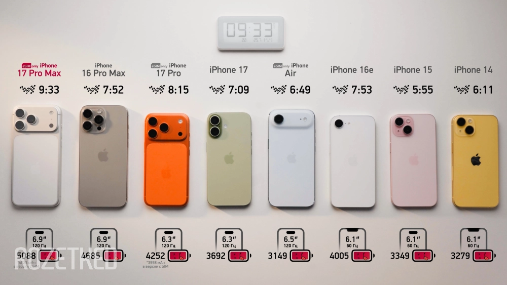 | iPhone 17 Pro Max (eSIM) | не тестировался | 8 часов 6 минут | 8 часов 40 минут | 8 часов 36 минут | 9 часов 33 минуты |