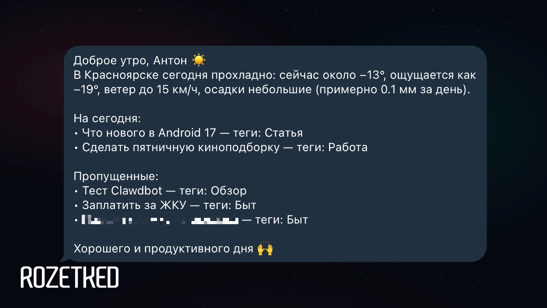 Гибкость — не единственное преимущество. OpenClaw может писать первым и выполнять задачи по расписанию: например, присылать утренний дайджест со списком задач, письмами, которые требуют ответа, и пробками по пути в офис.