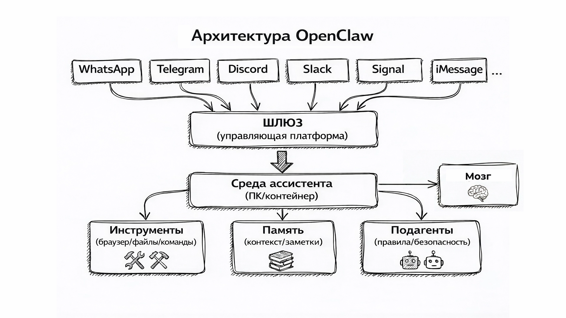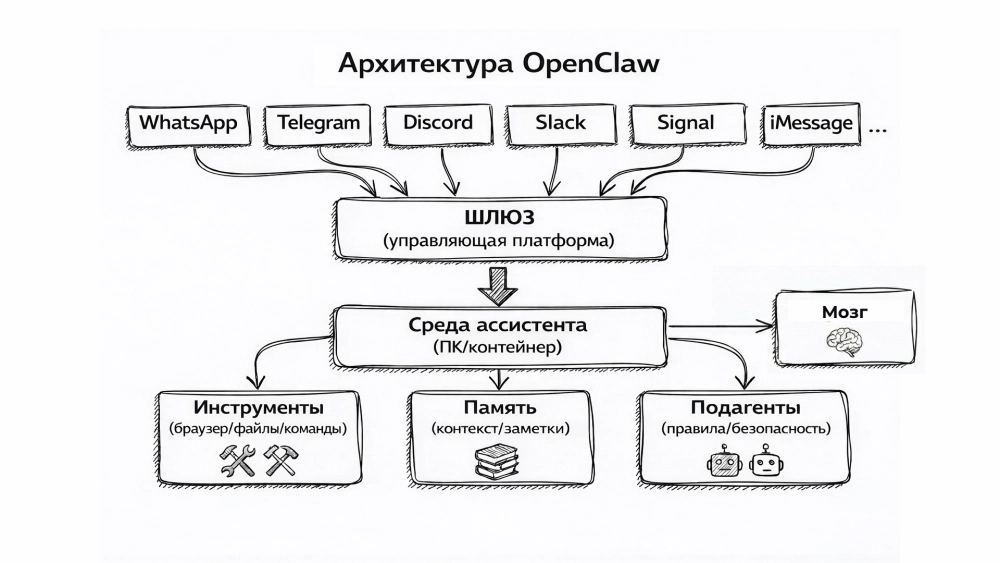OpenClaw — это не нейросеть как таковая, а оркестратор, который связывает генерацию текста силами LLM с внешними сервисами, памятью в виде текстовых файлов и возможности операционной системы. Вы описываете задачу в свободном формате — а OpenClaw «придумывает», какие способности ему нужно задействовать: залезть в файлы на компьютере, открыть терминал, воспользоваться браузером, подключиться к стороннему сервису по API-интерфейсу или даже написать код с нуля.