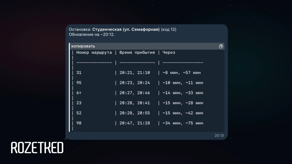 Вообще, OpenClaw может находить решения задач самостоятельно. Например, мне понадобилось выгрузить данные о прибытии автобусов к моей остановке. Открытого API-интерфейса у «Яндекс Карт» или у информационной системы города нет. Но ассистент сам сходил на сайт отслеживания транспорта, прочитал его содержимое и выдал в формате, который я запросил — а потом даже создал команду. Теперь мне достаточно ввести в чат /bus, чтобы узнать, когда прибудет мой любимый маршрут.