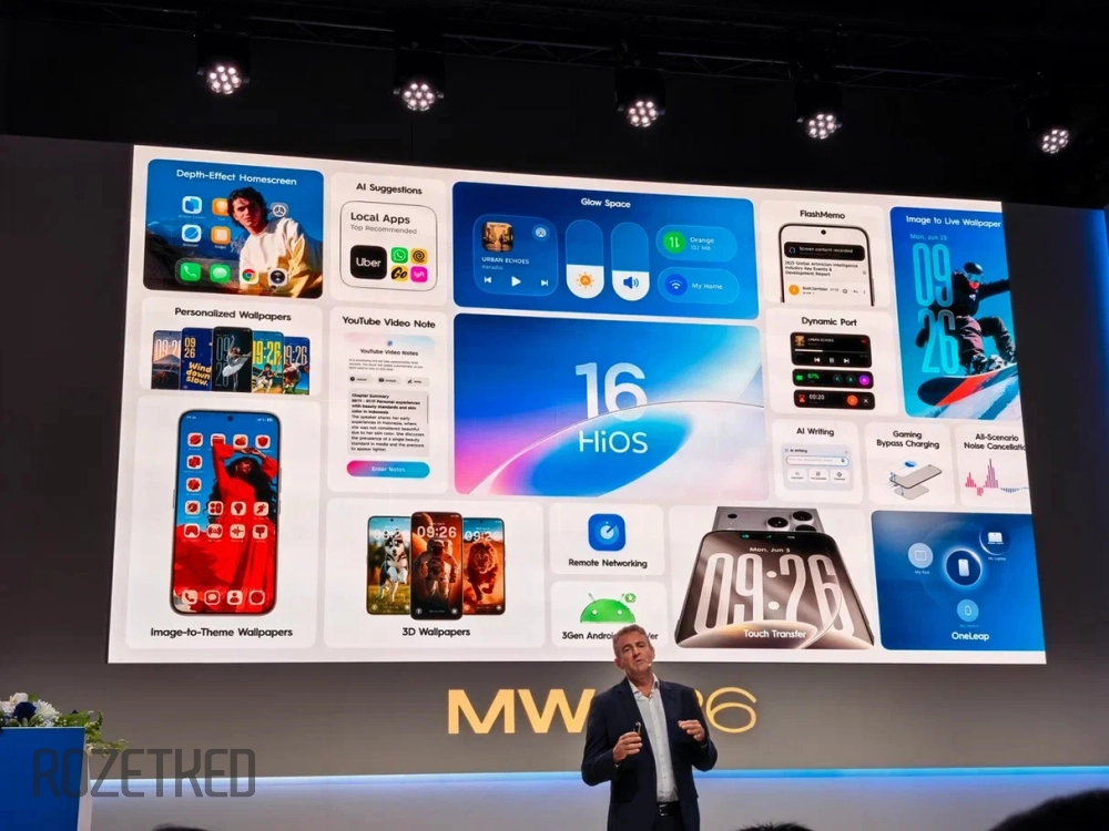 Заявлен сертификат TÜV Low Blue Light — глаза пользователя не должны страдать от синего света. Корпус толщиной 6,6 мм. Устройство работает на базе фирменной системы HiOS с ИИ-функциями.