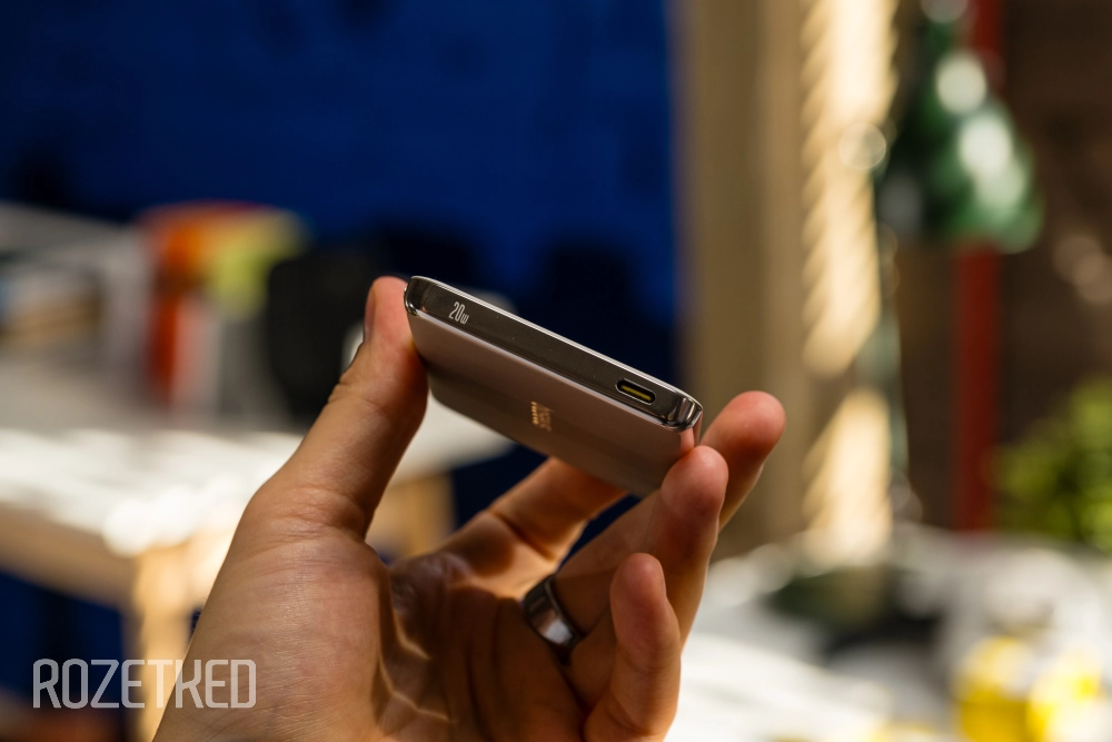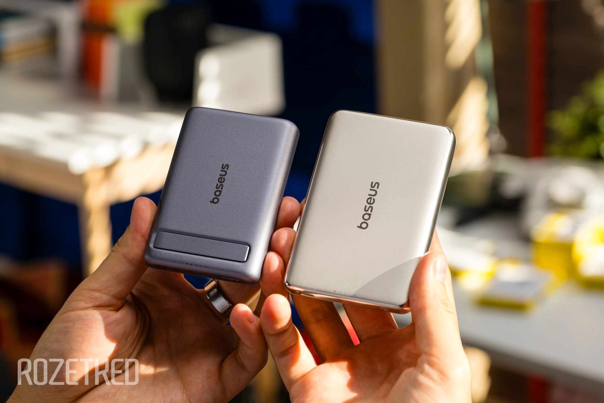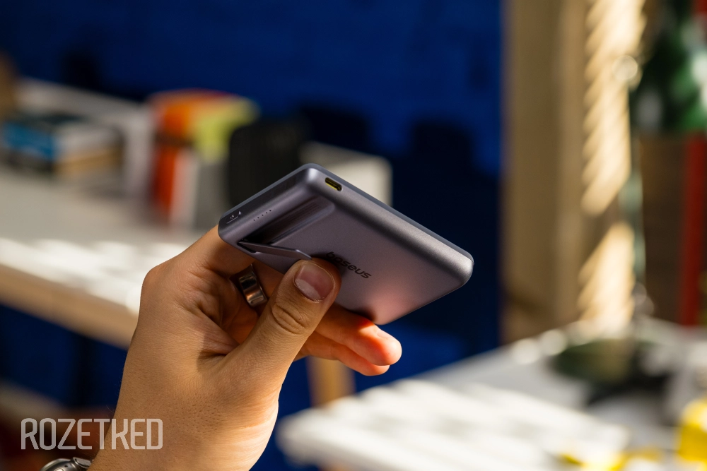 Второй — PicoGo AM31, тоже на 5000 мАч, тоже 20 Вт с поддержкой Qi2, но с бонусом. Она меньше, но толще предыдущей версии, USB-C у батарейки находится сбоку, а ещё есть откидывающаяся ножка — можно в процессе заряда, например, смотреть кино. Удобно.