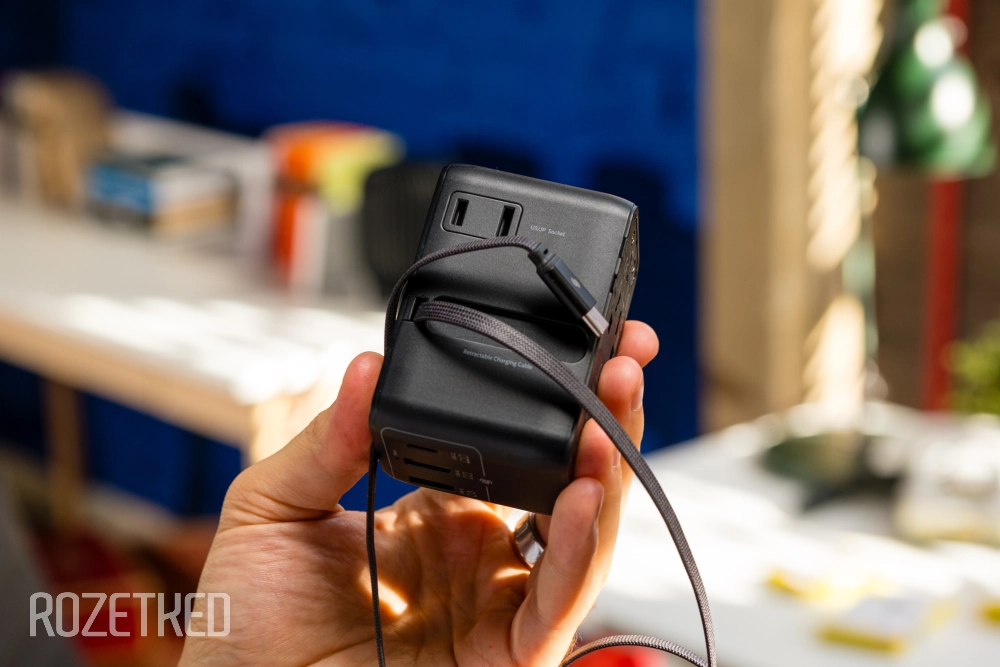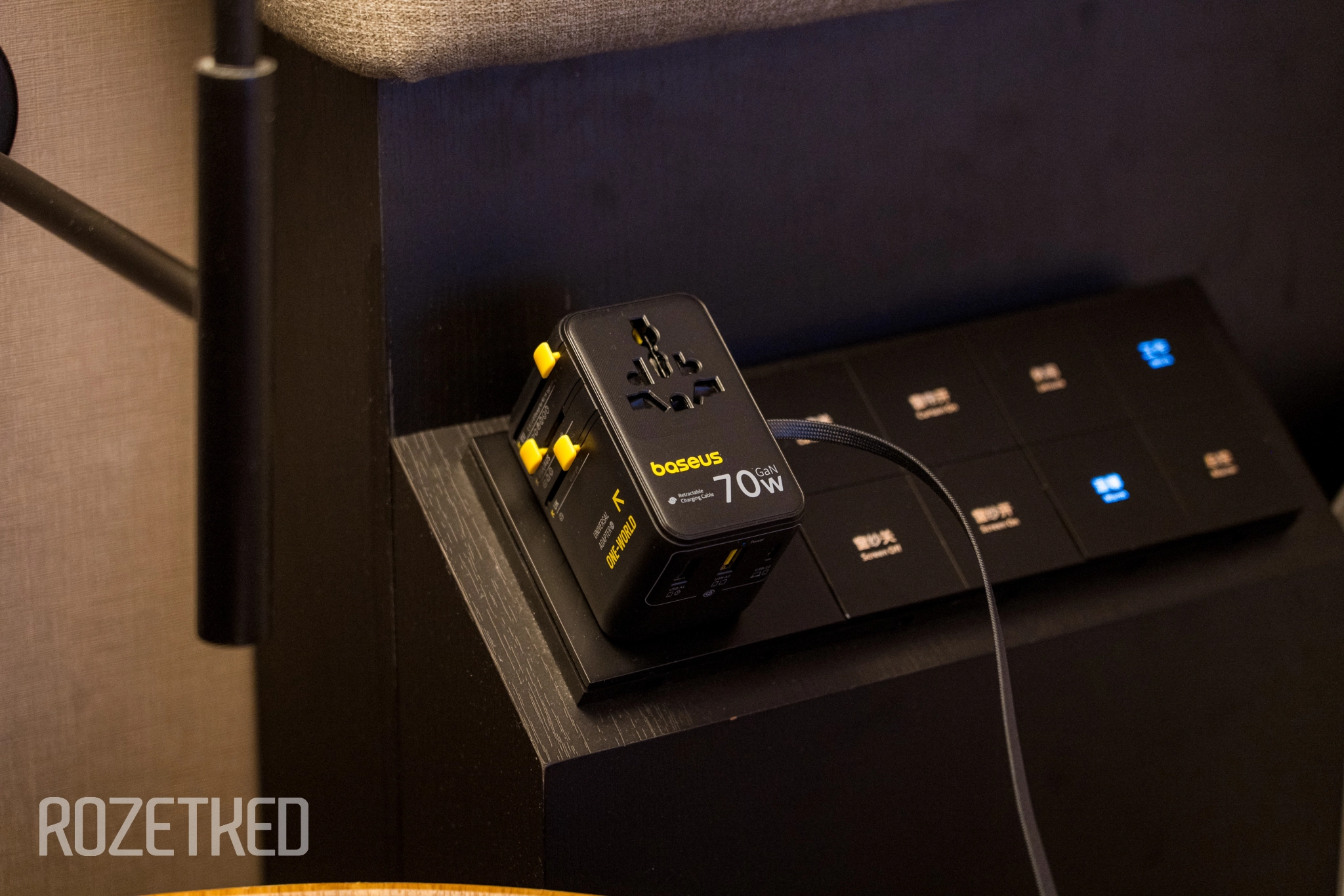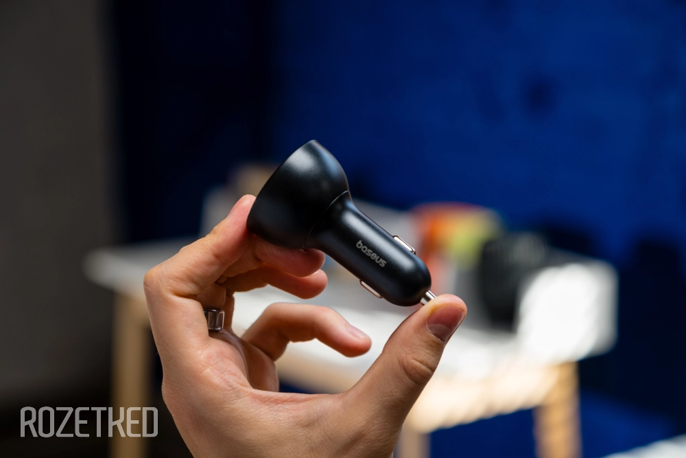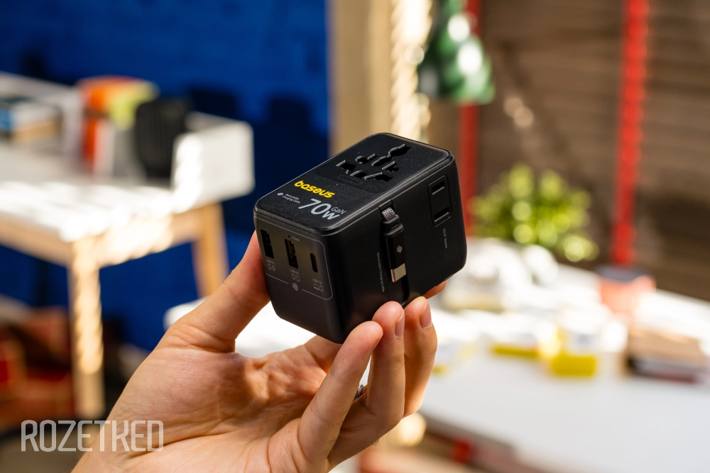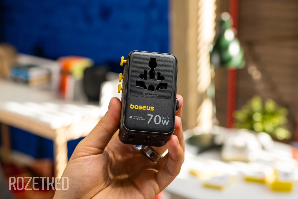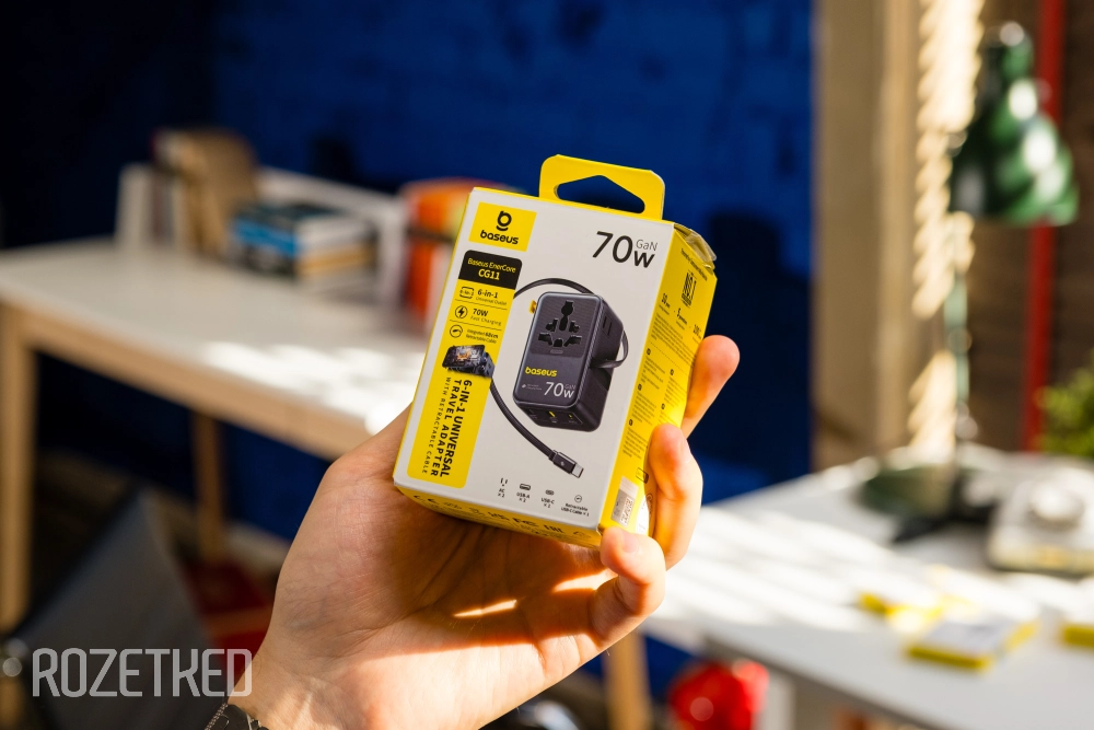 Первый — ультимативный. Baseus EnerCore CG11 — GaN-зарядка, в которой есть сразу всё: и переходники для всех мировых розеток, и встроенные два USB-A и один USB-C, и выезжающий кабель. Выдаёт такой адаптер 70 Вт мощи по встроенному кабелю или USB, чего хватит для большинства задач.