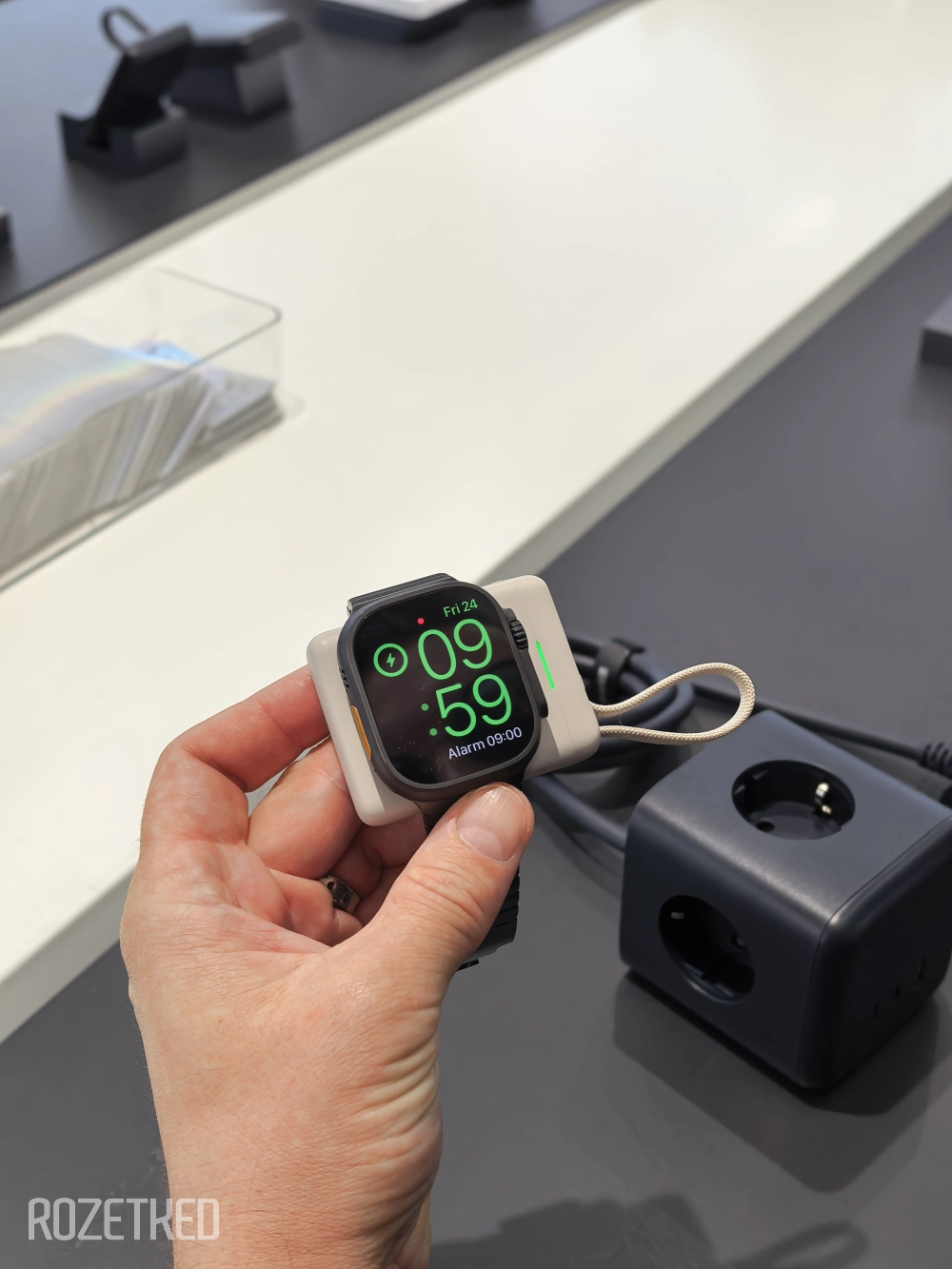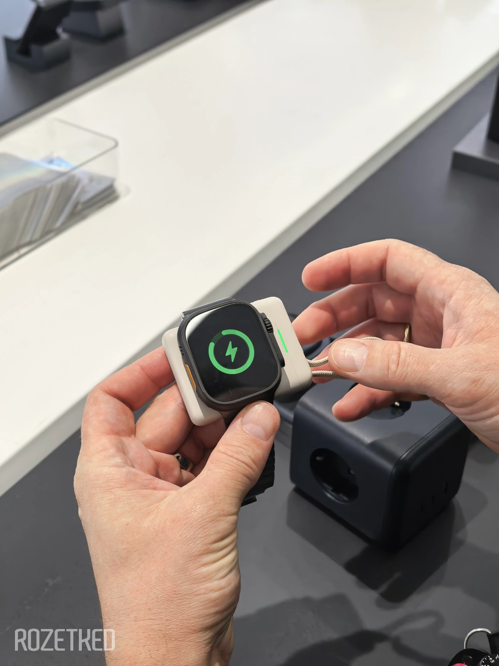 Это маленький пьедестал для зарядки Apple Watch с выходом USB-C. Можно воткнуть в адаптер питания, в пауэрбанк или даже в смартфон и зарядить часы. Единственный минус — скорость зарядки всего 2,5 Вт (придётся подождать).