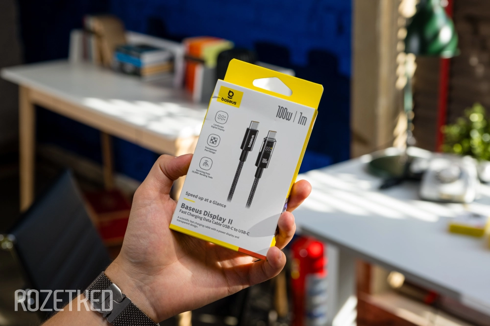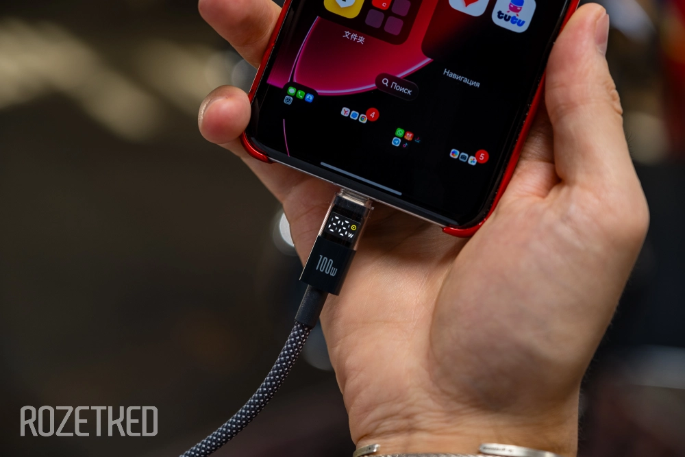 Классические кабели в ассортименте Baseus тоже есть, но я обратил внимание на вариант в тканевой обёртке с мощностью до 100 Вт и встроенным экранчиком, на котором выводится пропускная мощность. Зачем? Просто красиво. Но мы испробовали разные адаптеры и максимум удалось получить 30 Вт.