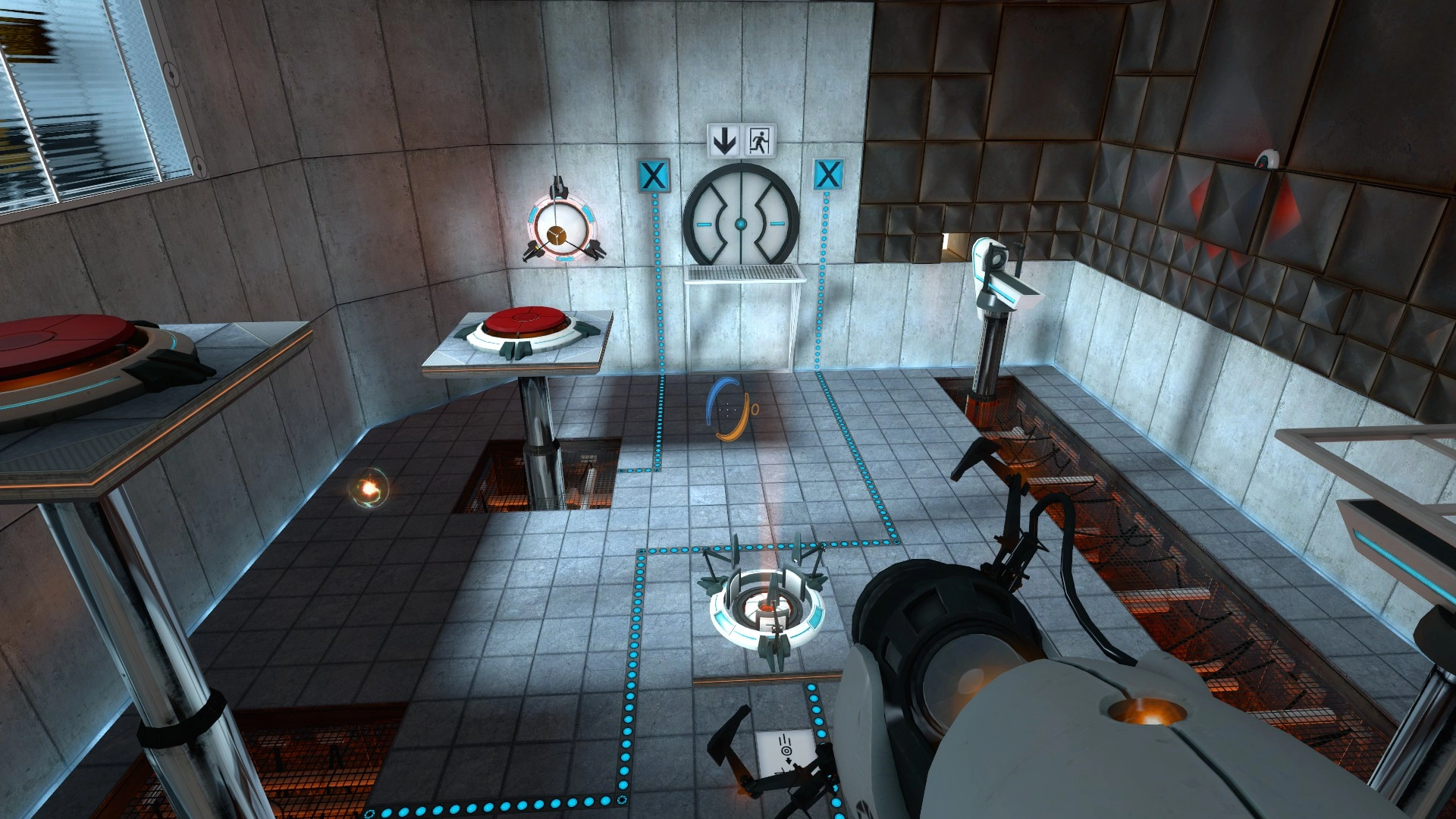 События Portal разворачиваются в той же вселенной, что и Half-Life, но игры между собой связаны мало. Сюжет рассказывает о девушке Челл, которая проходит испытания в лаборатории Aperture, где изучались порталы. Собственно, на порталах и завязаны все головоломки. Разместил один портал на одной стене, а второй на другой — и вуаля, можно перемещаться между ними.