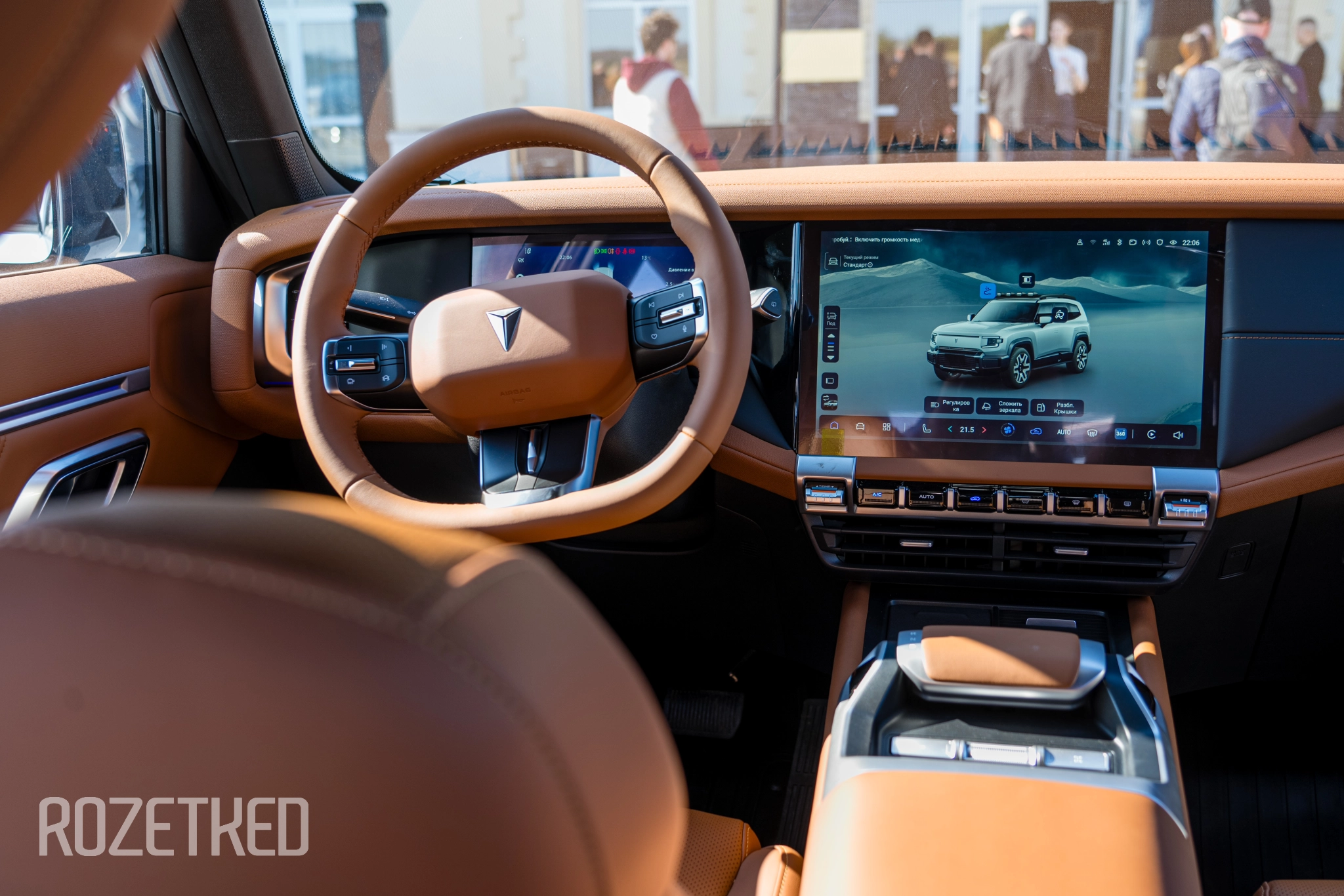 В салоне тоже всё без аскезы: подогрев всех сидений, вентиляция и массаж у водительского кресла, двойное остекление, аудиосистема на 16 динамиков, багажник до 1600 литров (внутри есть розетка) и набор ассистентов вроде адаптивного круиза и кругового обзора. А ещё есть управления со смартфона и встроенная SIM, предоплаченная на три года. CarPlay проводной, Android Auto добавят позже, как и сервисы «Яндекса».
