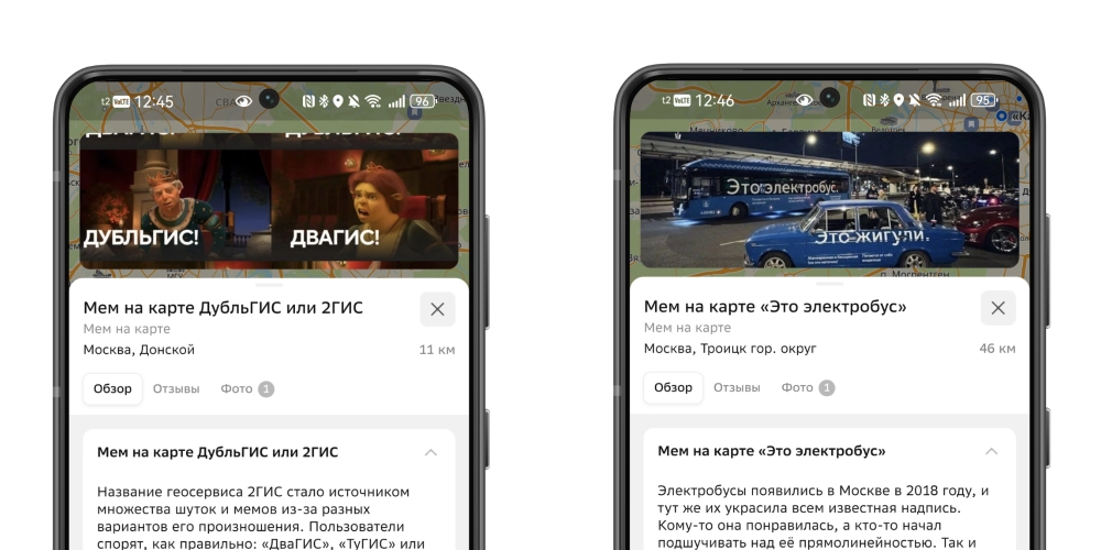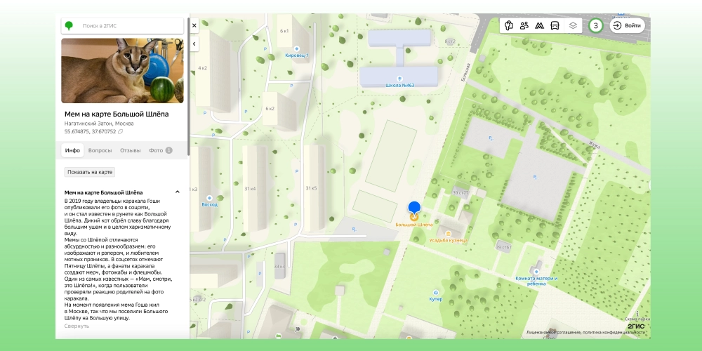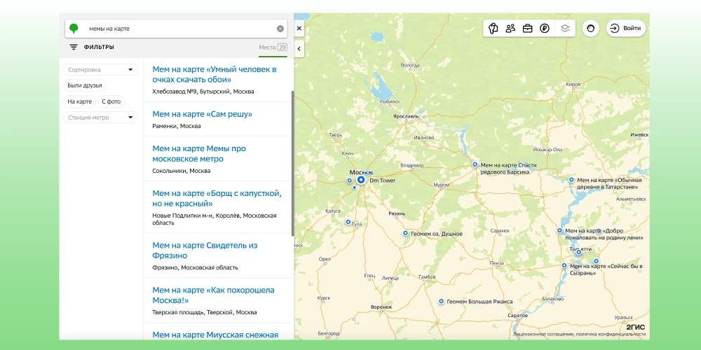 Найти их несложно — нужно просто написать в поиске приложения «мемы на карте». Работает как в мобильном приложении, так и в веб-версии.