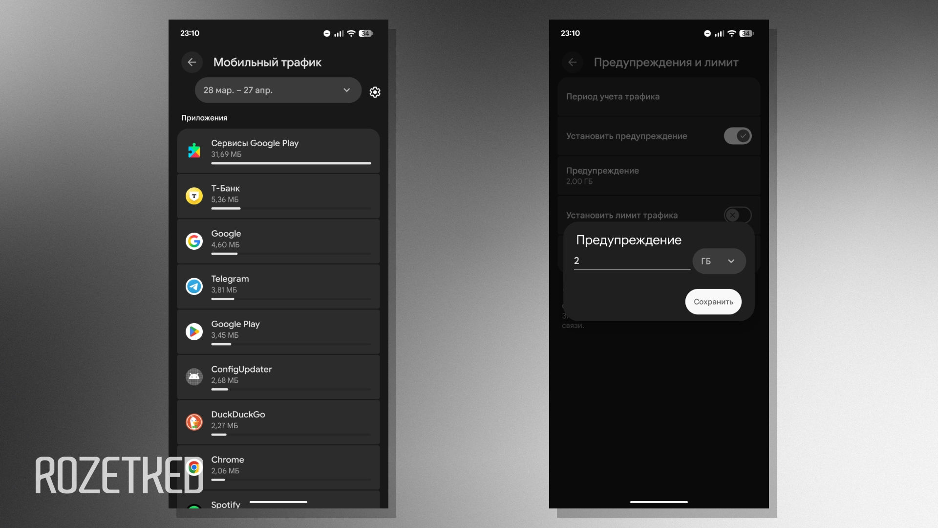 В Android расход трафика рассчитывается помесячно. Конкретный путь до статистики отличается в зависимости от оболочки: например, на Pixel необходимо открыть «Настройки» и перейти в раздел «Сеть и интернет» → «SIM-карты» → название нужной SIM-карты → «Трафик приложений».