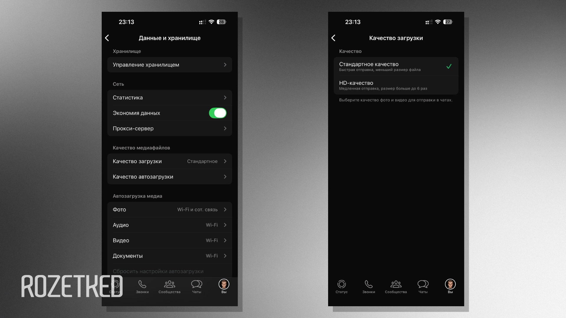 Для экономии трафика также логично выбрать стандартное качество загрузки медиа и документов вместо HD.