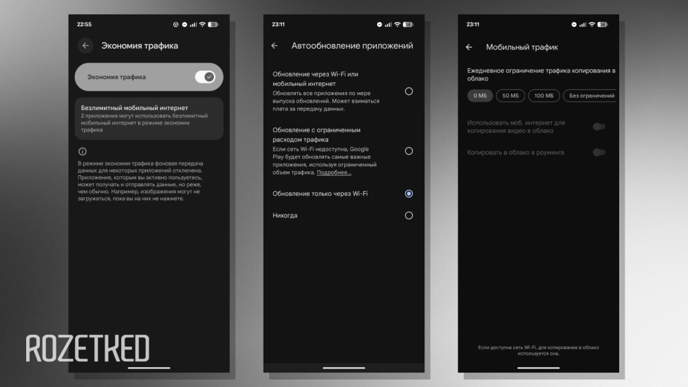 2. В разделе «Трафик и онлайн-режим» активируйте опцию «Экономия трафика» и отключите «Скачивание по мобильной сети».