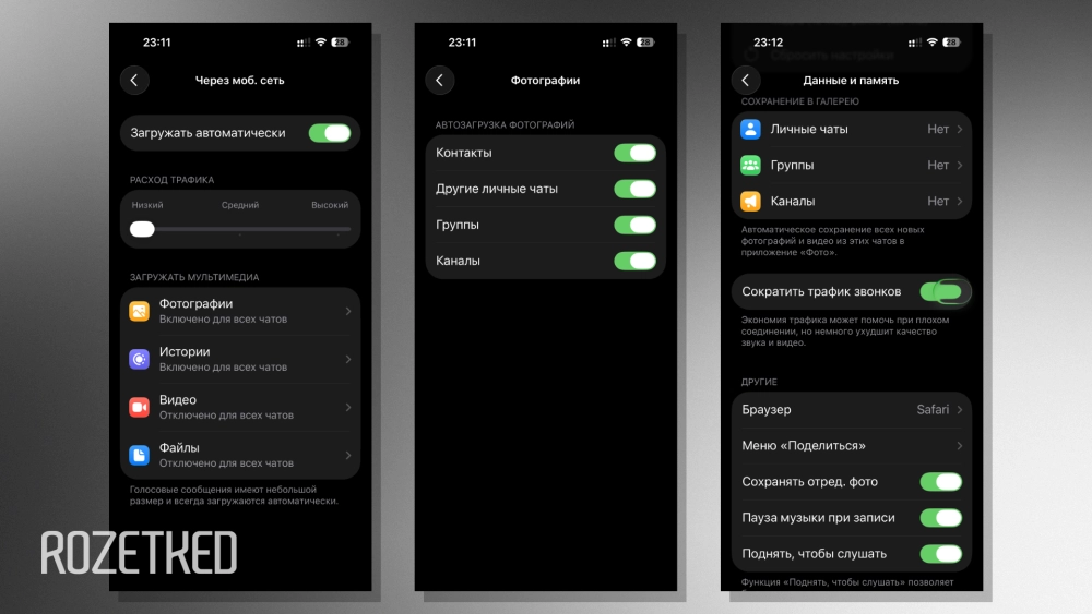 Оба мессенджера предлагают настройку потребления данных. Общий принцип — отключить или ограничить автозагрузку медиафайлов: даже если вы просто листаете канал в поисках нужного поста, встречающиеся по пути картинки и видео начинают скачиваться автоматически. Зато текстовые сообщения почти ничего не весят.