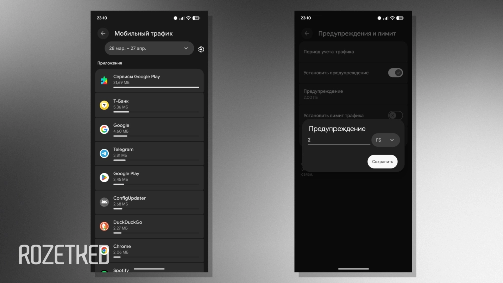 На Android ещё удобно установить предупреждение о потреблении свыше установленного лимита. Для этого в разделе «Трафик приложений» нужно нажать на значок шестерёнки и выбрать пункт «Предупреждение».