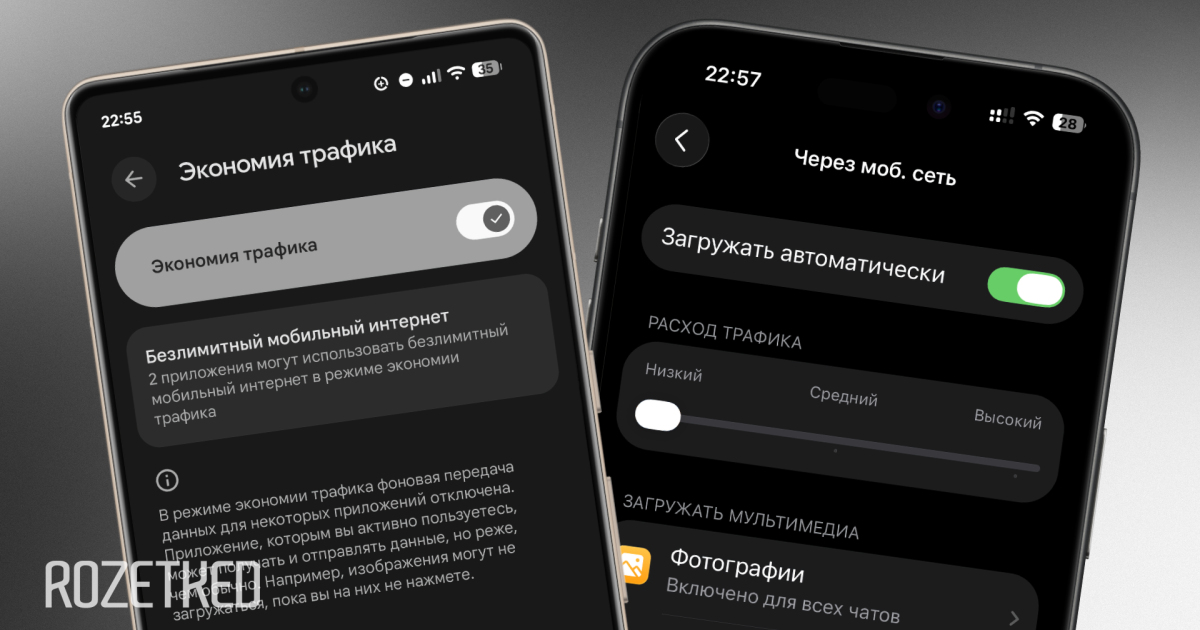 WhatsApp*. В мессенджере есть опция «Экономия данных», которая находится на вкладке «Настройки» → «Данные и хранилище». На этом же экране можно настроить автозагрузку фото, аудио, видео и файлов: отключить совсем или оставить только для Wi-Fi.