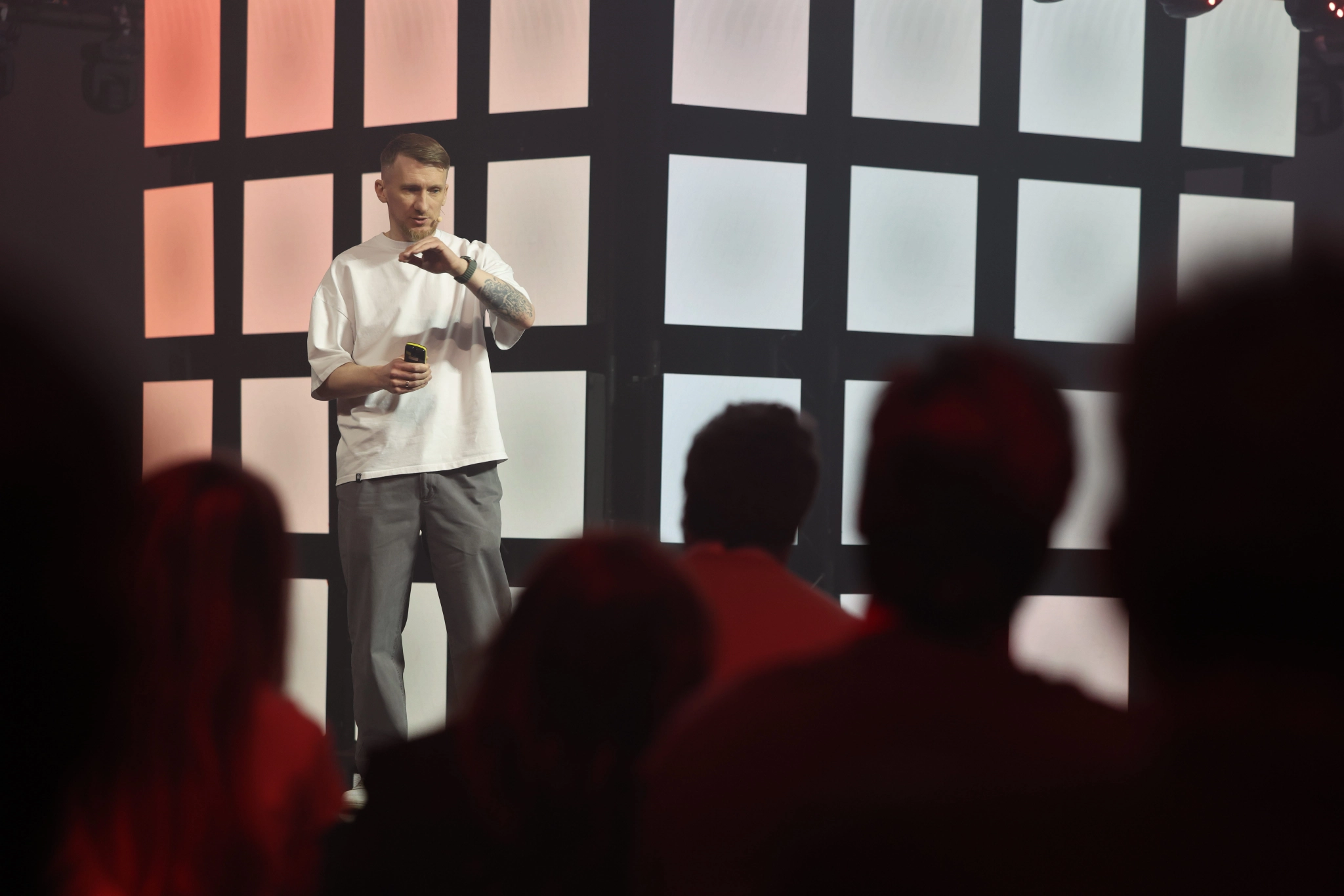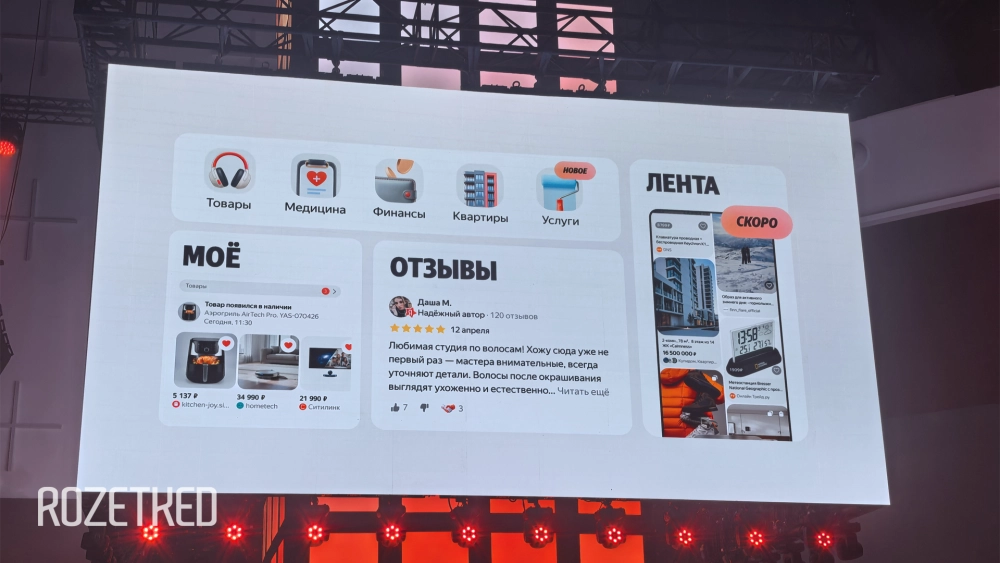 Далее на сцену вышел Дмитрий Тимко, руководитель «Поиска». Главной темой его выступления стал рассказ о новых продуктах. Диалог с «Алисой AI» и «Поиск по Услугам» представил как раз таки руководитель «Поиска».