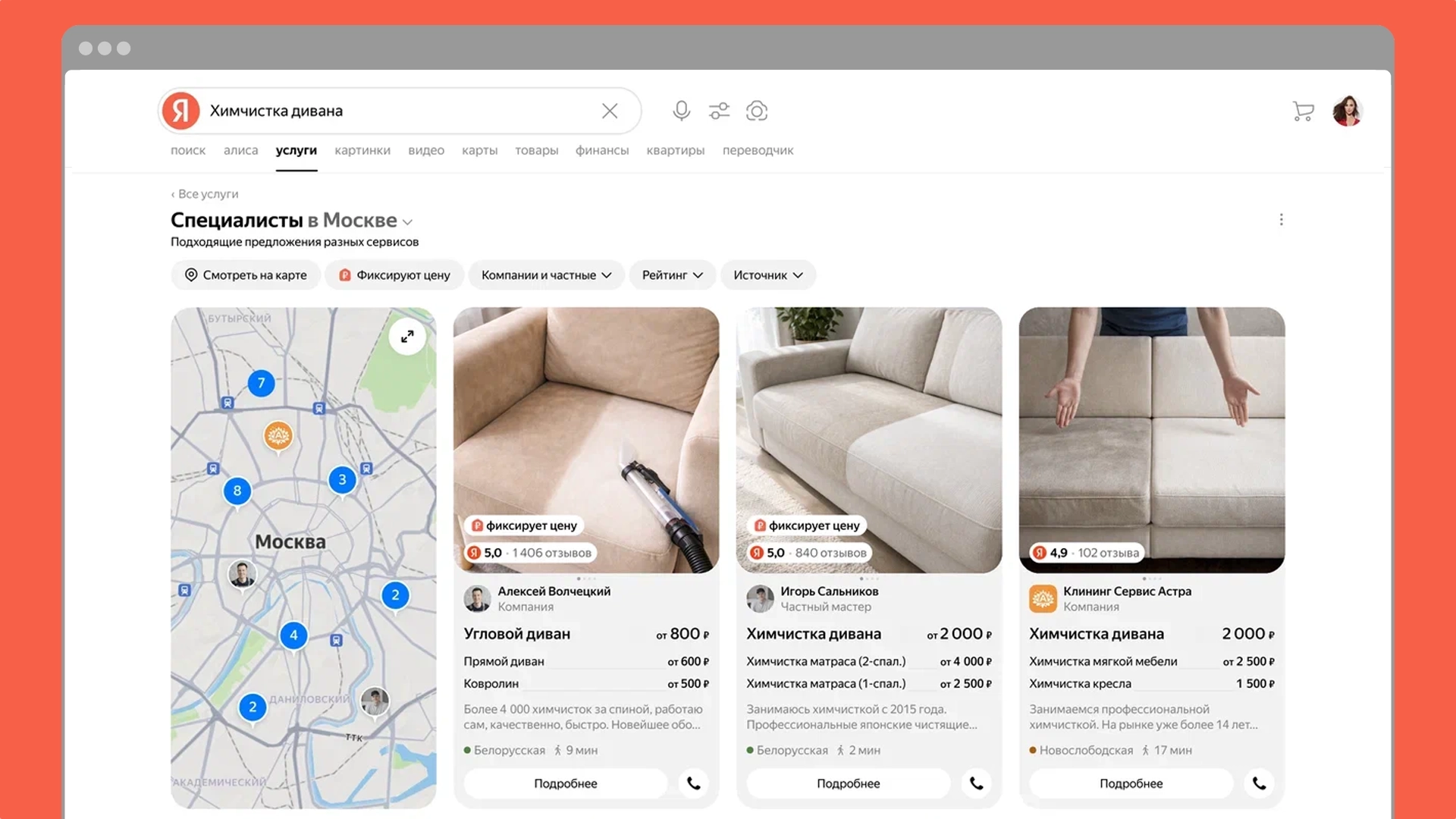 Подходящие исполнители будут представлены в виде карточек, где отображаются прейскурант, иллюстрации, короткое описание и способы связи. Дополнительно есть рейтинг, система фильтров и бейдж «Фиксирует цену» — он означает, что у специалиста проверены документы, а в отзывах пользователи отмечают соблюдение оговорённой заранее стоимости.