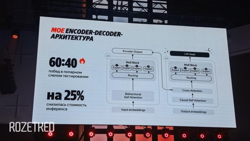 Суть в том, что поисковую систему переводят на новую архитектуру ИИ-моделей. Она основана на Encoder-Decoder, где одна часть анализирует инфоконтекст, а другая генерирует результат. Для повышения эффективности в эту архитектуру добавили слои Mixture of Experts.