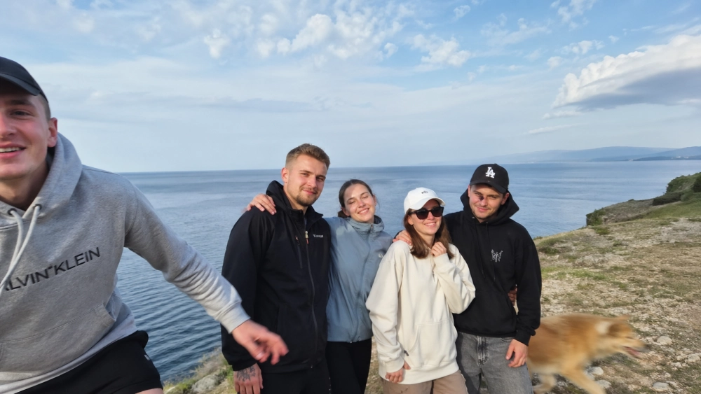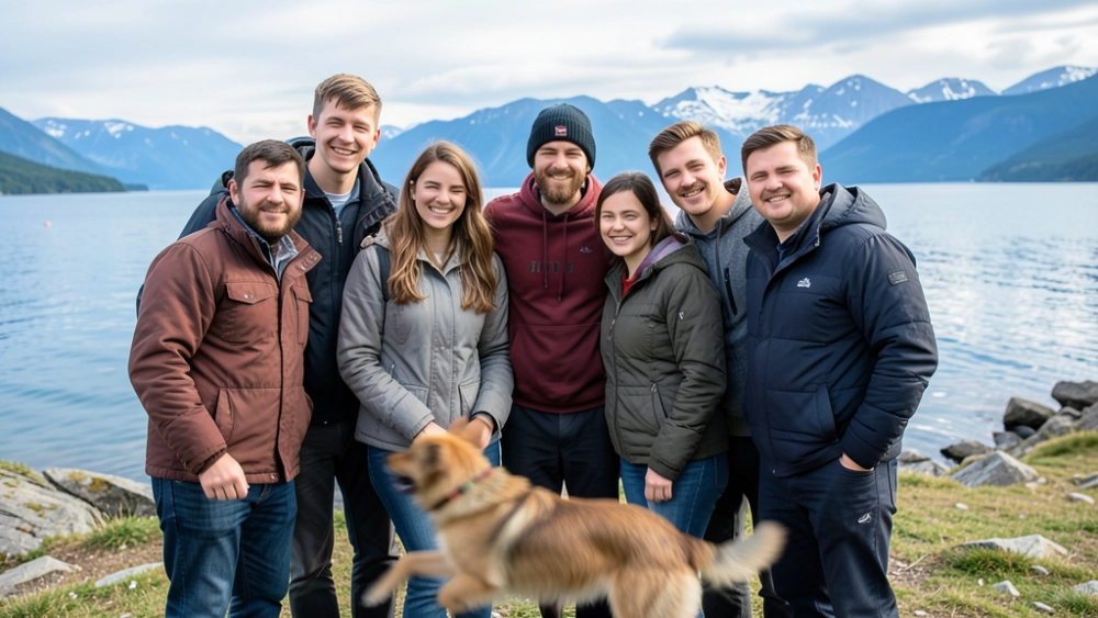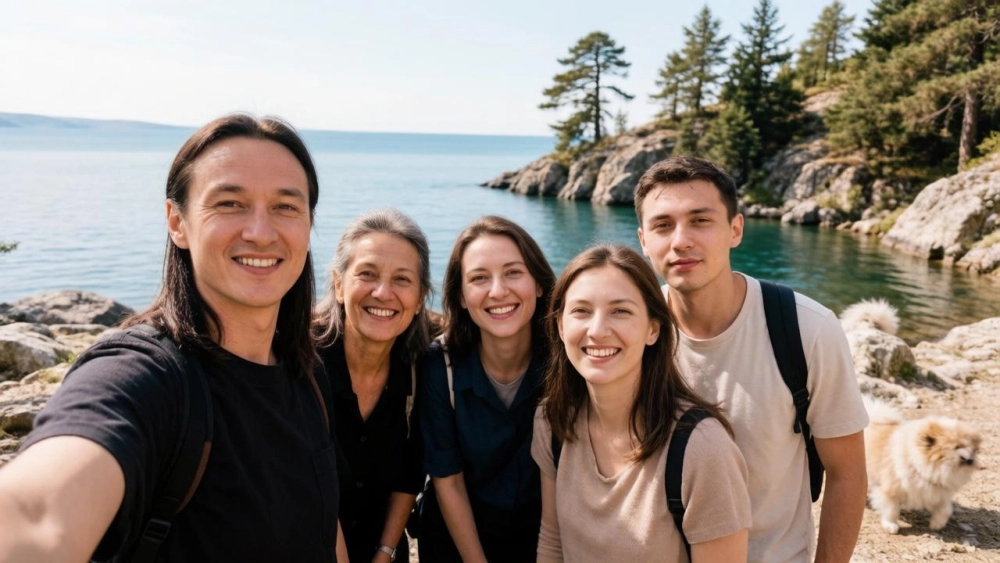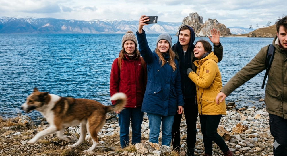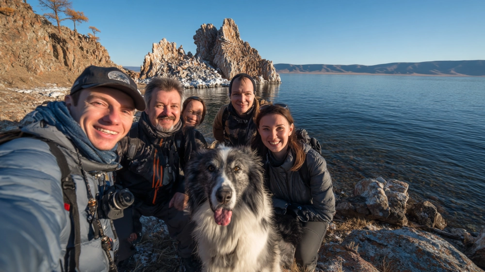 | Реалистичное фото: компания из пяти друзей пытается сфотографироваться на фоне Байкала, но один человек моргнул, второй не успел встать в кадр, собака размазана в движении. |