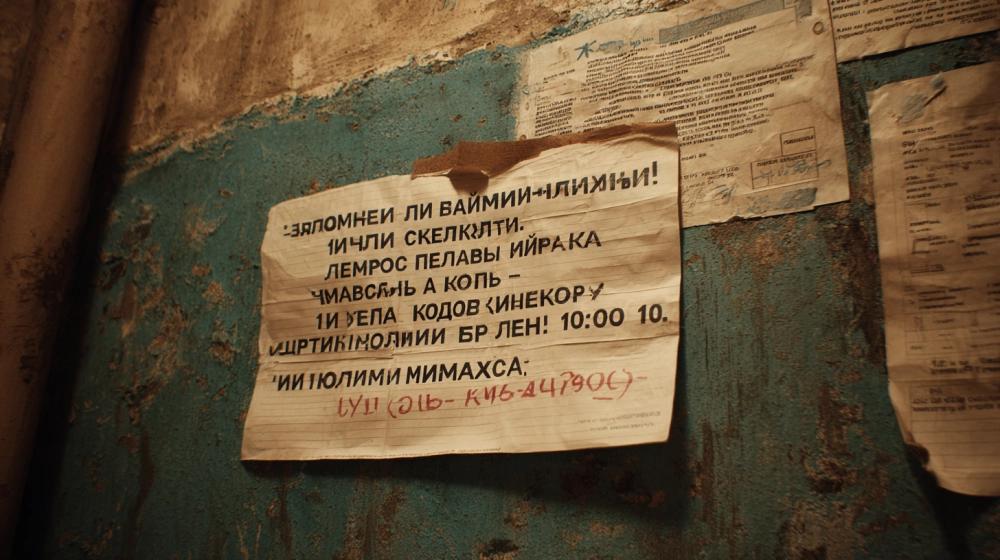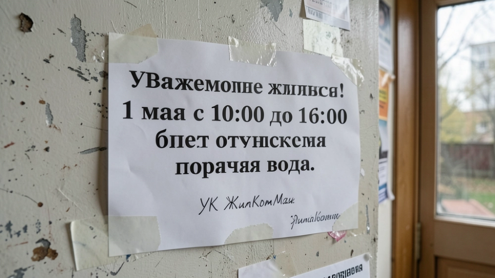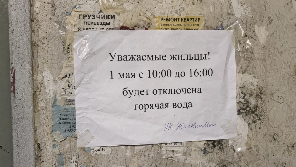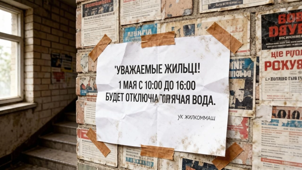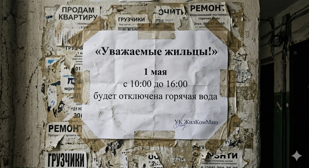 | Реалистичное фото объявления в подъезде хрущёвки: лист бумаги на грязной стене поверх других объявлений, приклеен скотчем. Текст: «Уважаемые жильцы! 1 мая с 10:00 до 16:00 будет отключена горячая вода». Ниже маленькая подпись от руки: «УК ЖилКомМаш». Бумага чуть помята. |