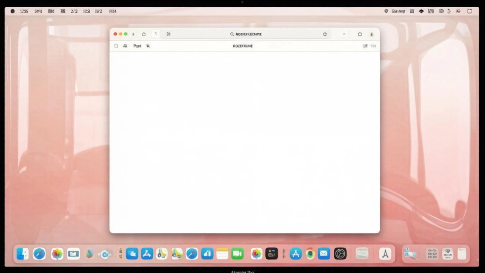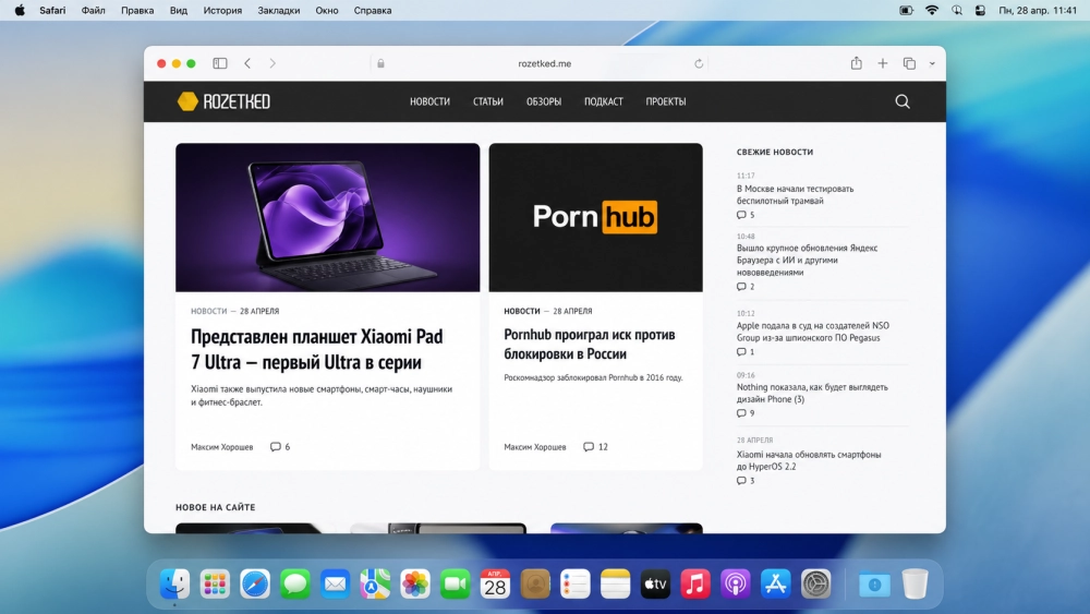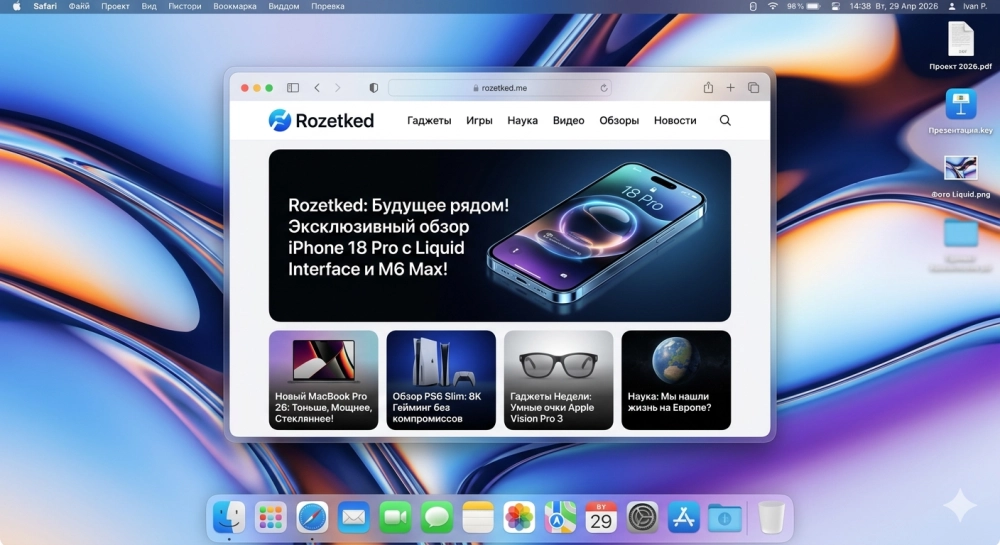 | Скриншот экрана Макбука. Стандартный интерфейс macOS 26 с Liquid Glass, докбар внизу. По центру окно Safari с открытым сайтом rozetked.me |