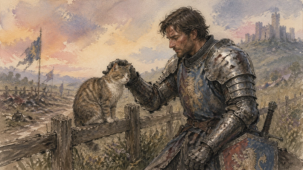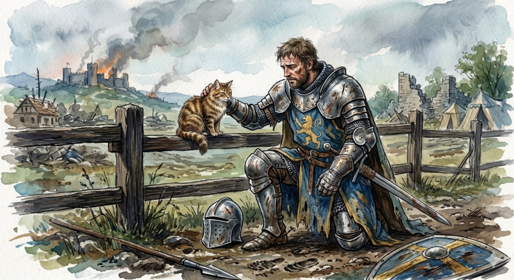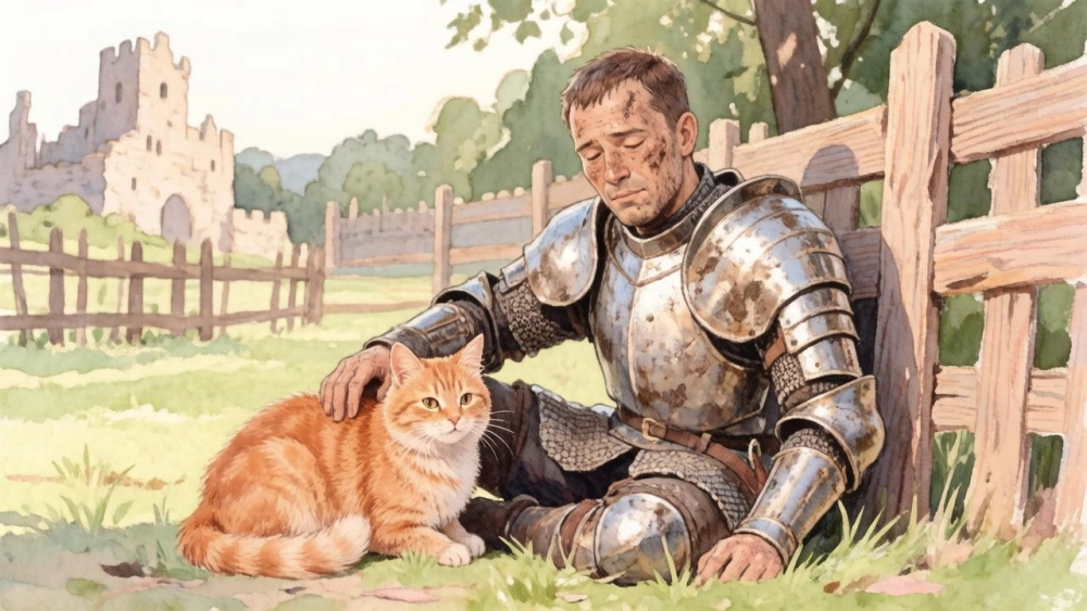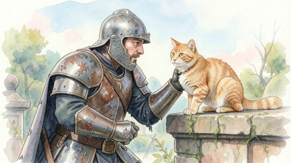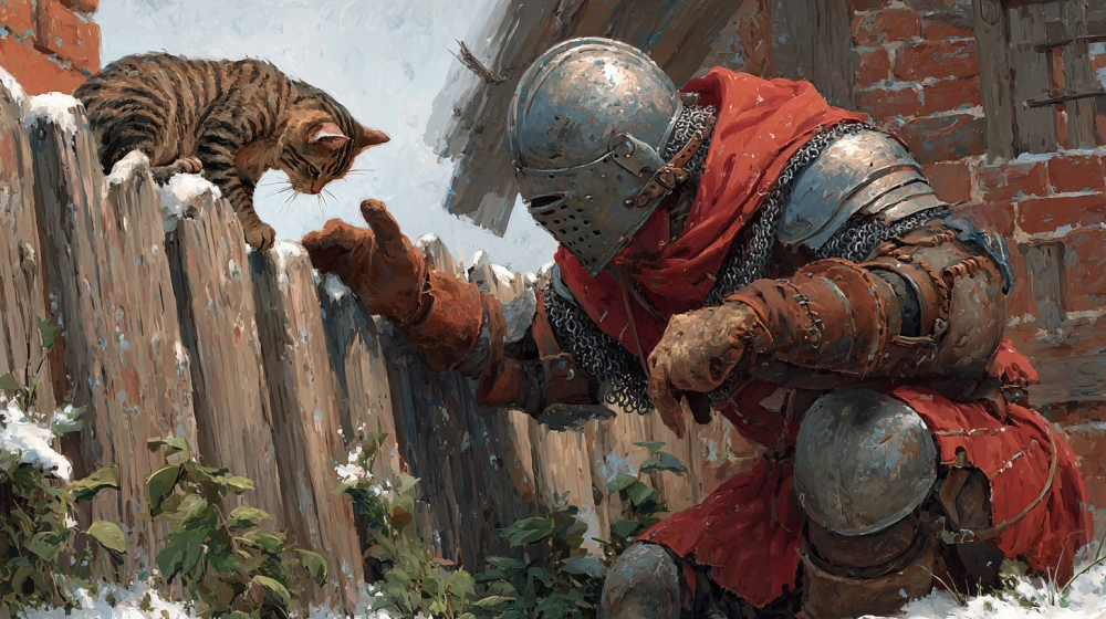 | Средневековый рыцарь после тяжёлого боя гладит кота, сидящего на заборе. Доспехи рыцаря помяты. Стиль: акварель плюс пастель поверх. |