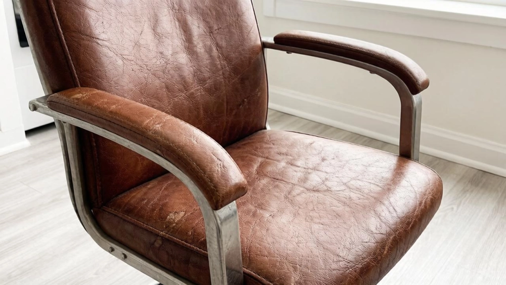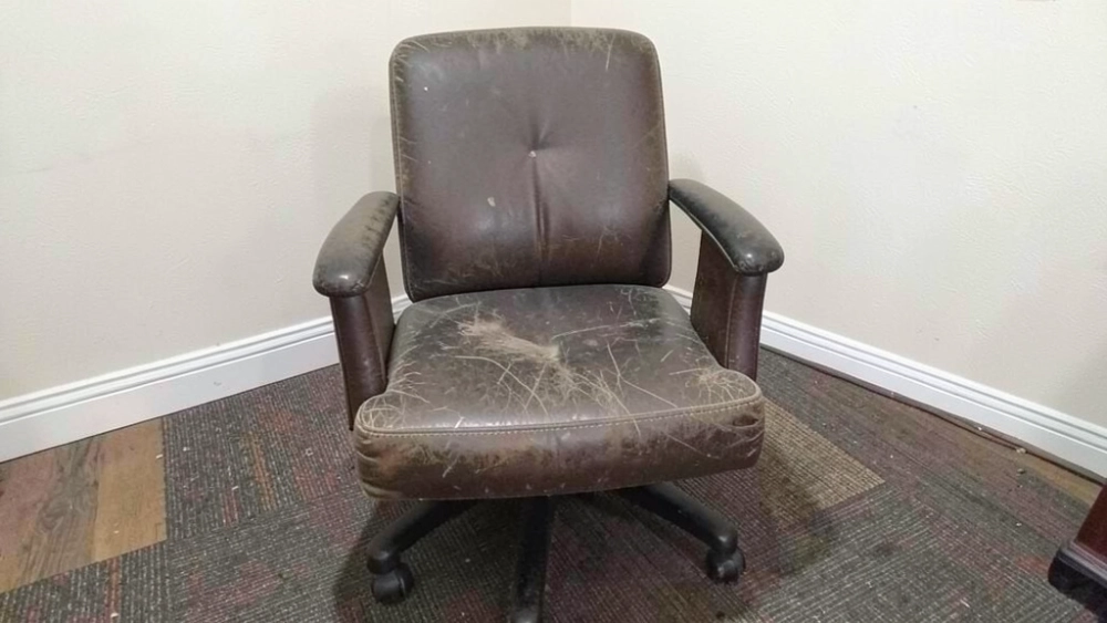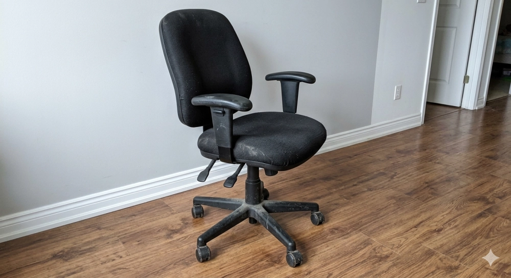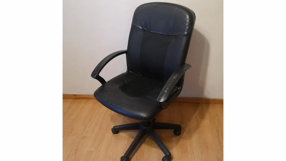 | Фото старого офисного кресла для объявления на продажу: снято на телефон, на фоне ламинат и плинтус, кресло немного потёртое, но не разваливается. Ощущение, что человек просто быстро сфоткал предмет перед продажей. |