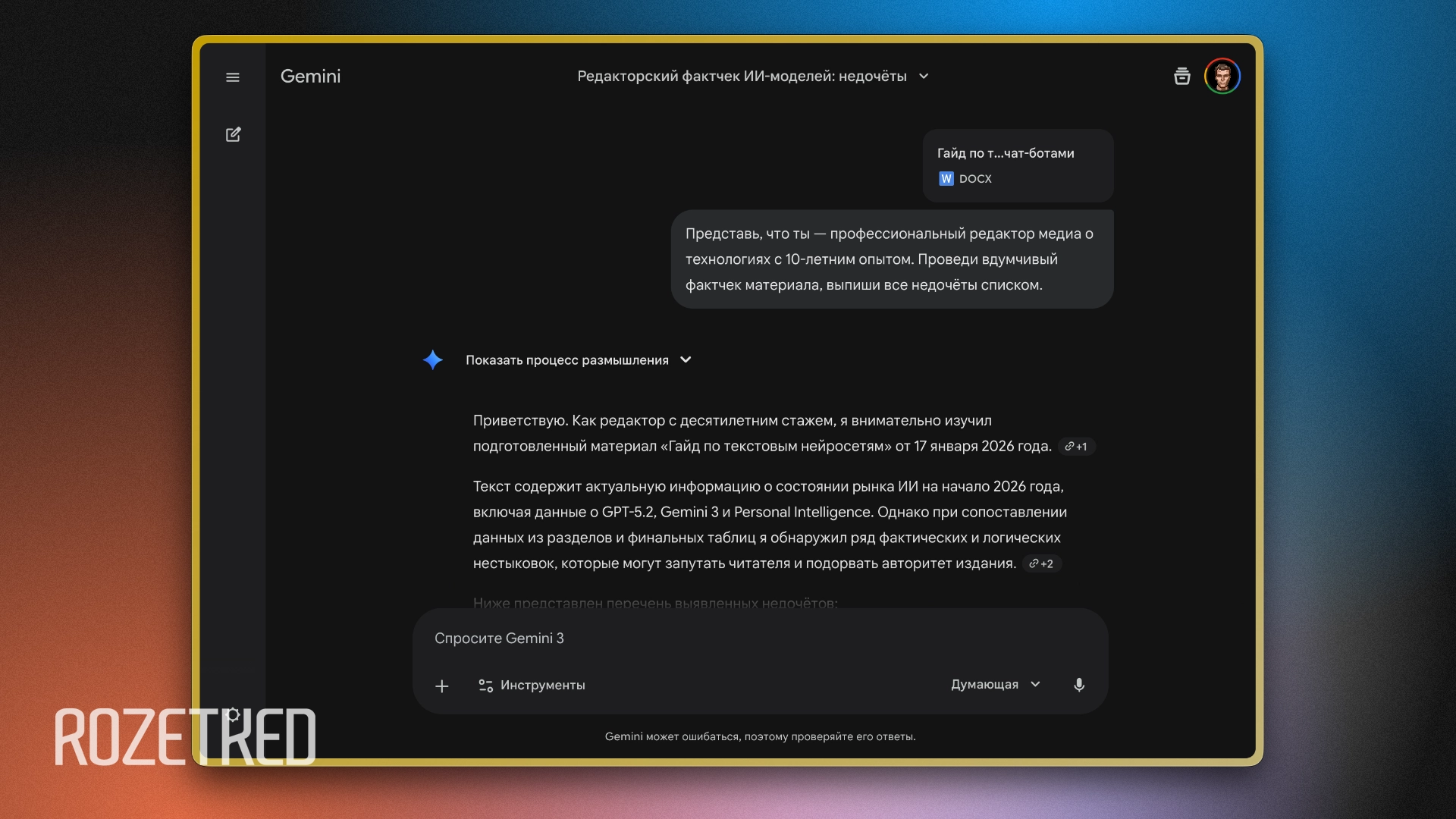 В интерфейсе есть переключение между текстовыми моделями. На сегодняшний день самая мощная нейросеть Google — Gemini 3 Pro. Она работает в режиме «рассуждений». Для более быстрых ответов есть Gemini 3 Flash.
