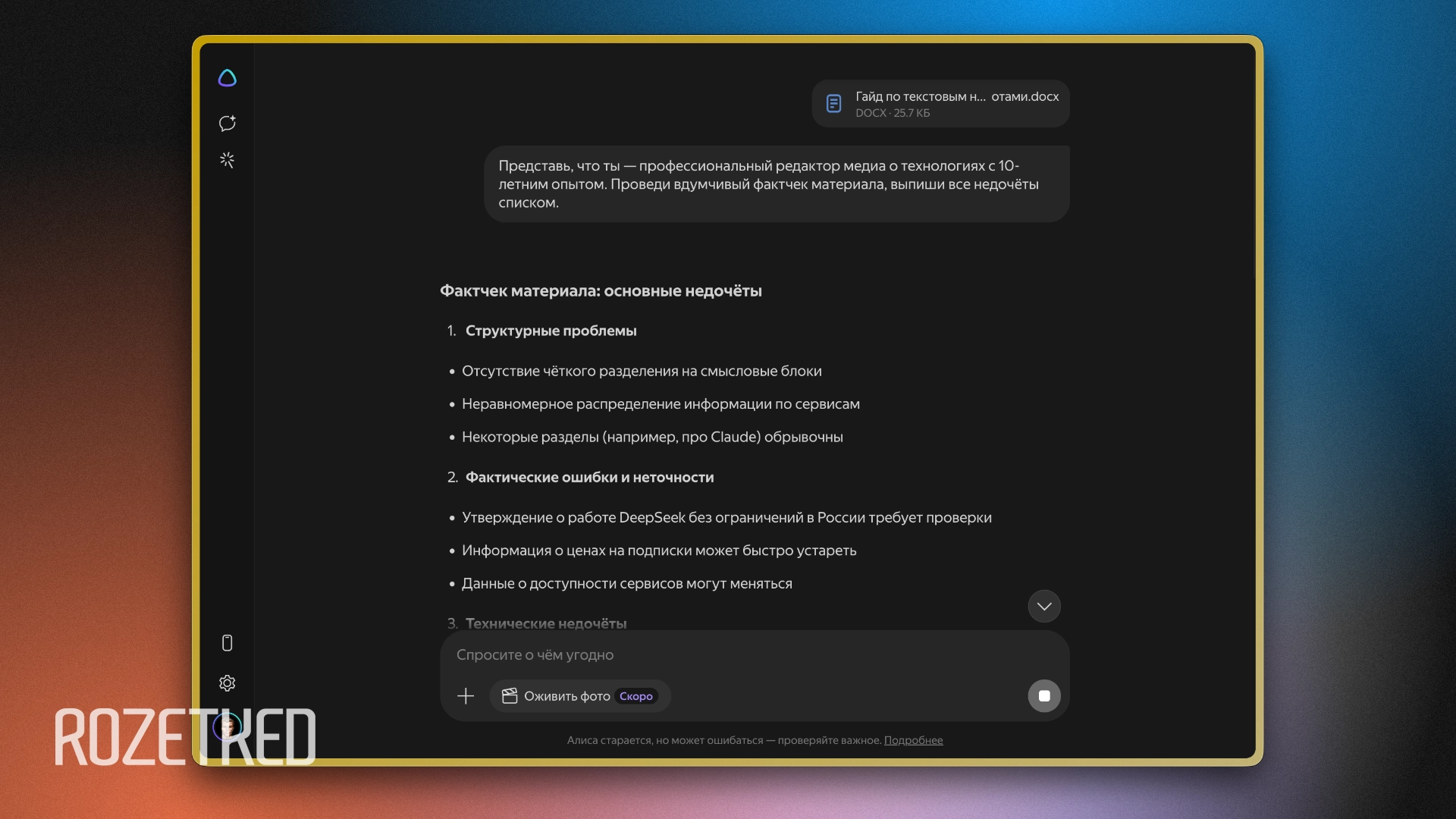 - Анализ текстовых документов. Можно загрузить и изображение, но нейросеть сможет только распознать текст на нём.