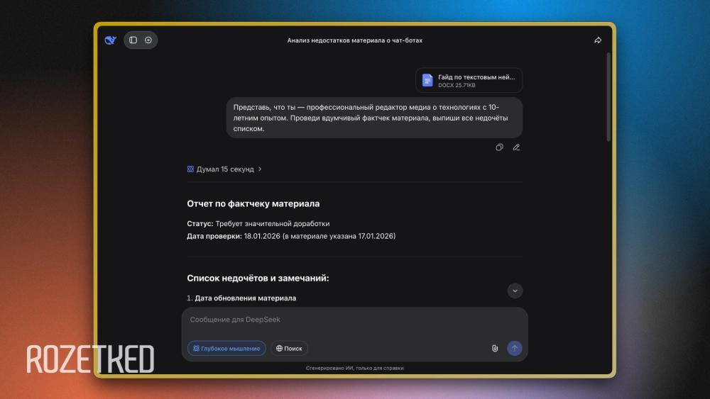 С точки зрения функциональности DeepSeek — самый «бедный» чат-бот в подборке. У него есть: