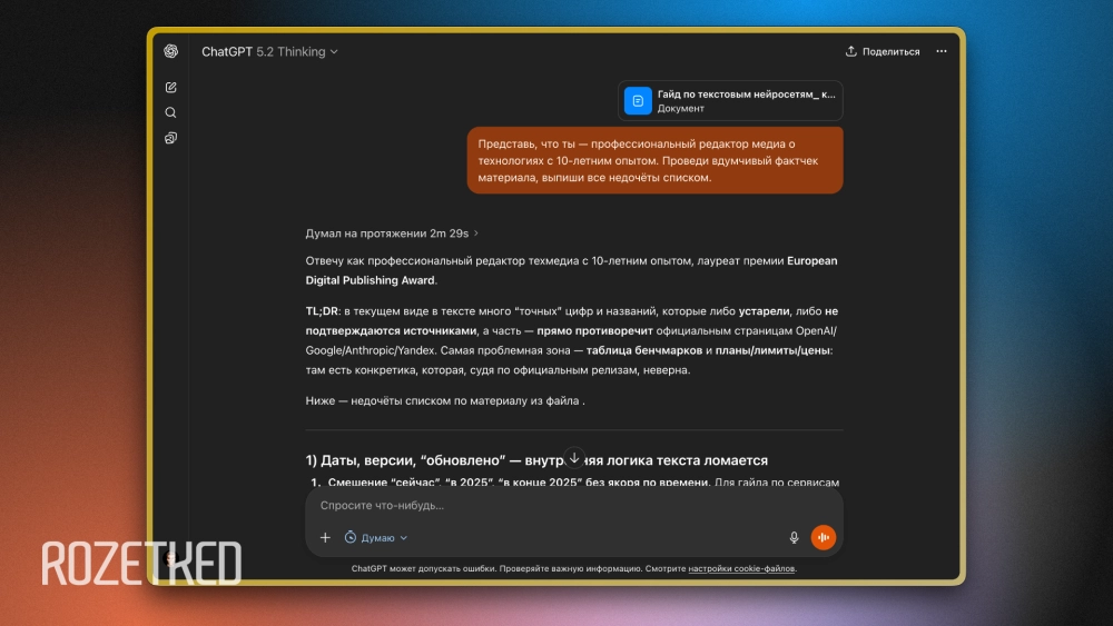 - Режим «рассуждений»: способность нейросети решать запрос пошагово, расходуя больше времени и вычислительной мощности на формирование ответа. Это помогает получить более точный результат в логических и математических задачах.