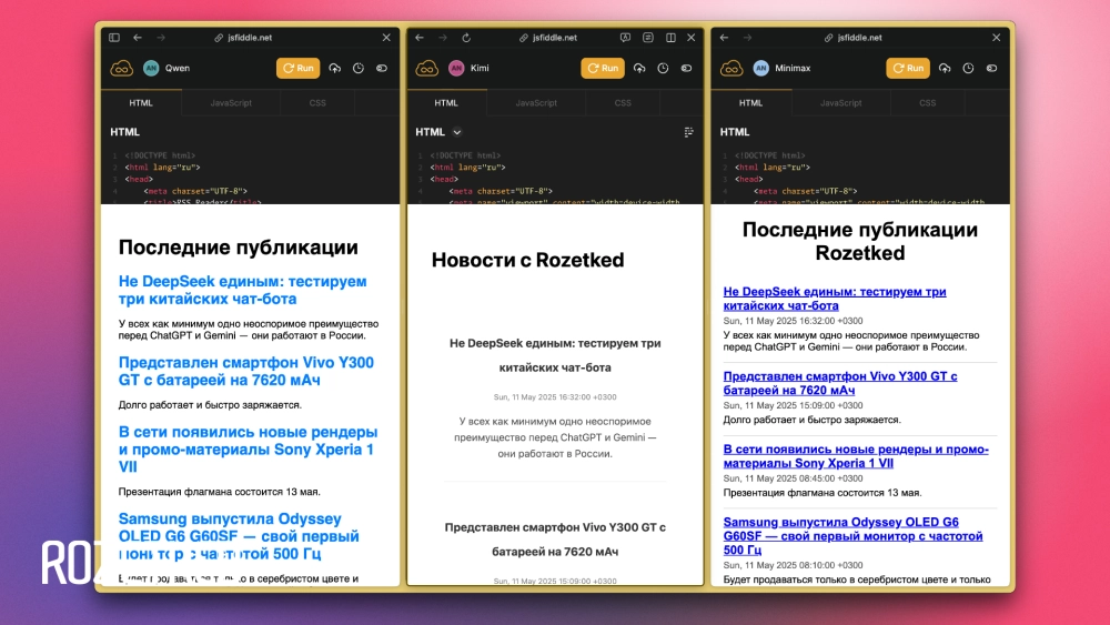 Генерация кода. В этой задаче выделился Kimi, который способен исполнить написанный код — можно сразу оценить результат. Правда, режима редактора, как в ChatGPT, у сервиса нет. Также Kimi единственный из троицы позаботился о проксировании для запроса новостей с нашего сайта — без этой детали код не заработает. Ещё нейросеть добавила обработку ошибок и достаточно подробно объяснила смысл кода.