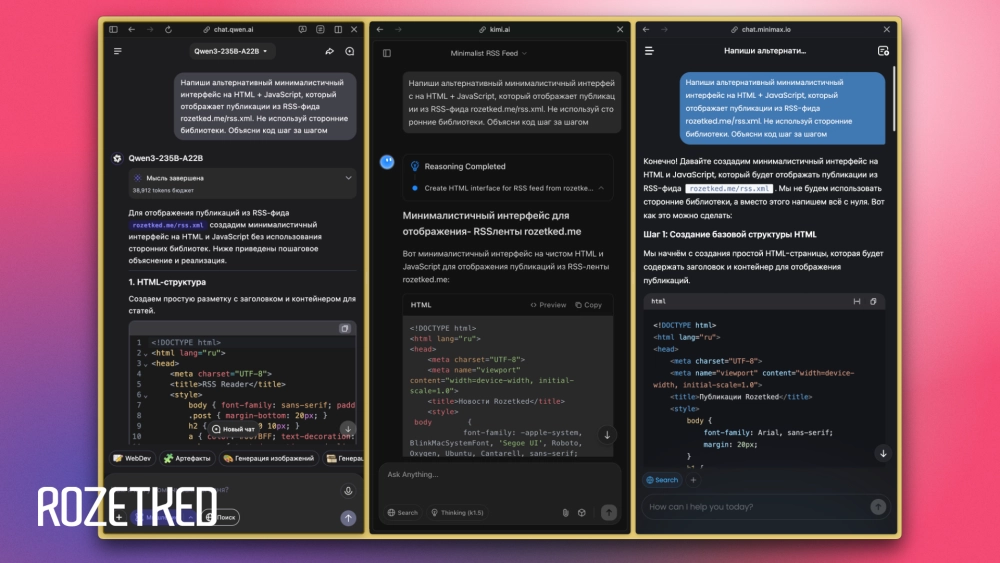- Генерация кода: «Напиши альтернативный минималистичный интерфейс на HTML + JavaScript, который отображает публикации из RSS-фида rozetked.me/rss.xml. Не используй сторонние библиотеки. Объясни код шаг за шагом»