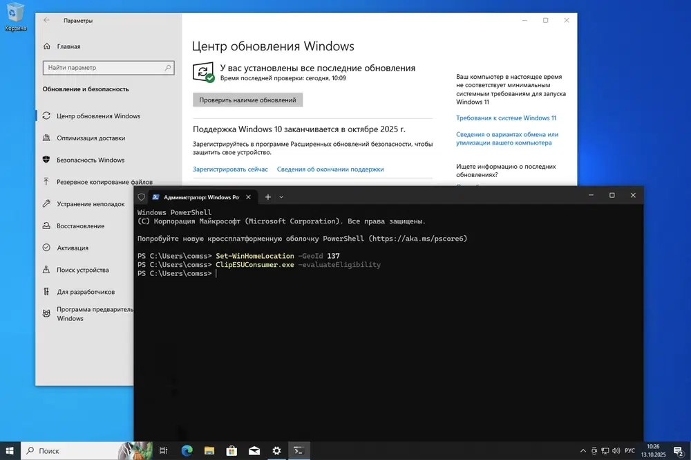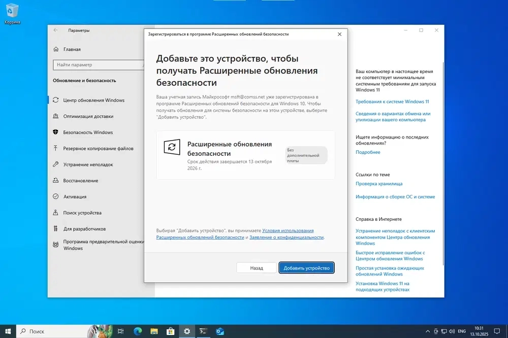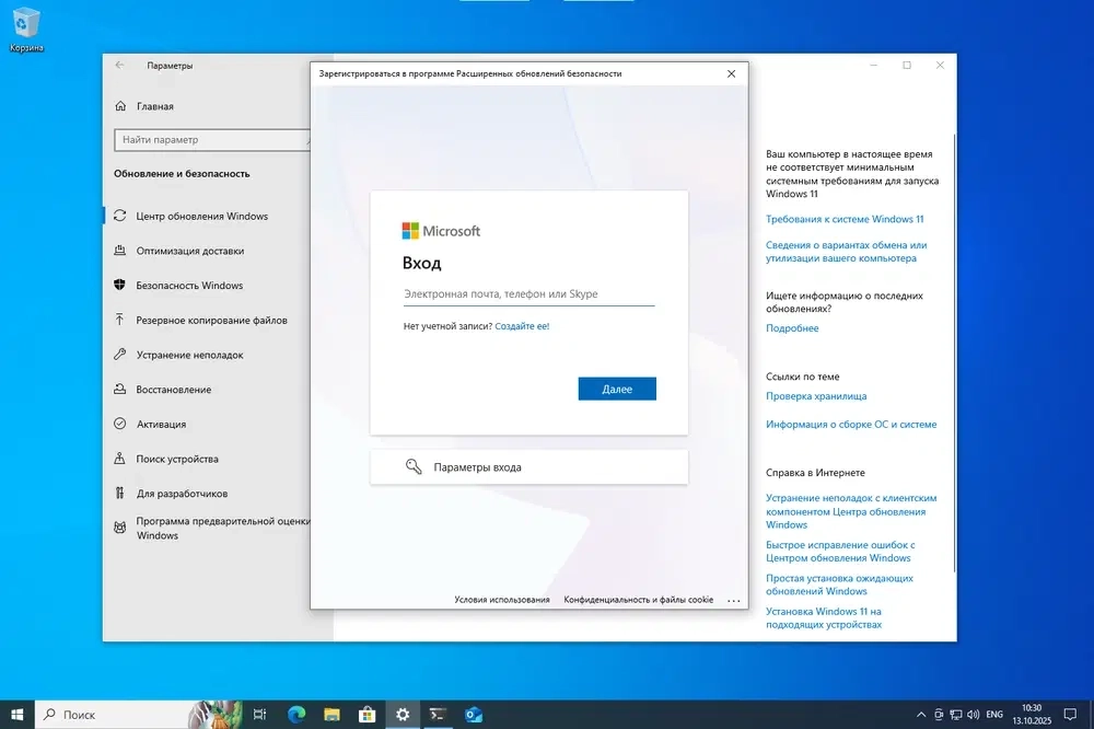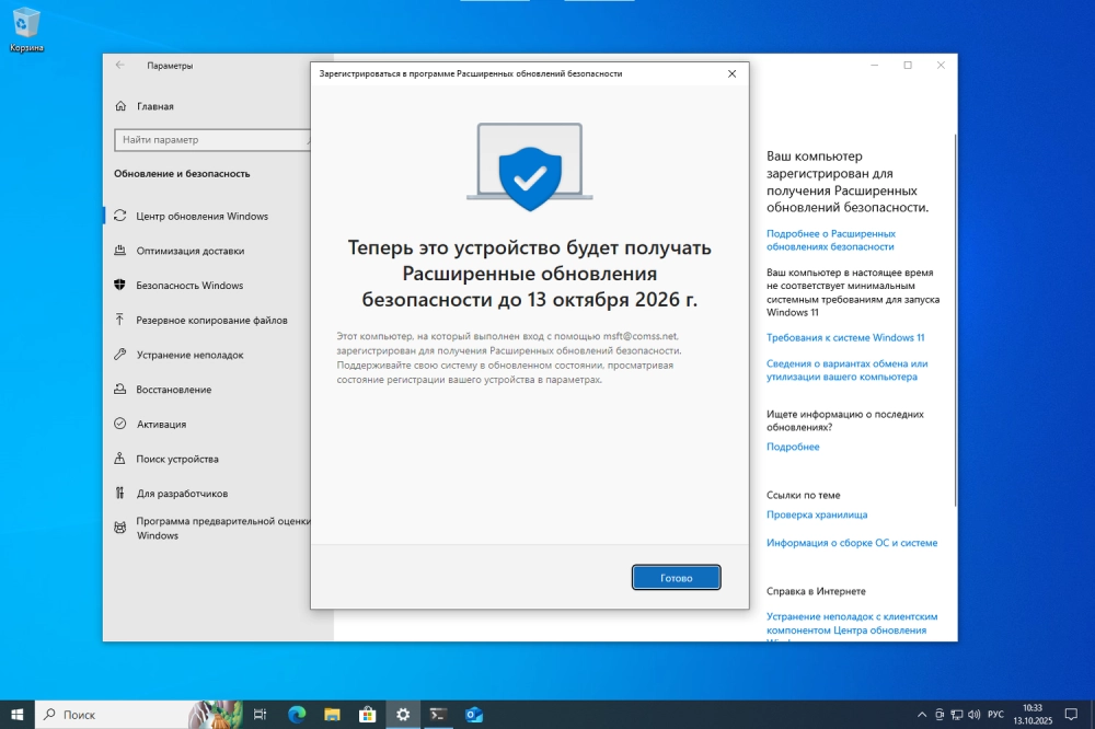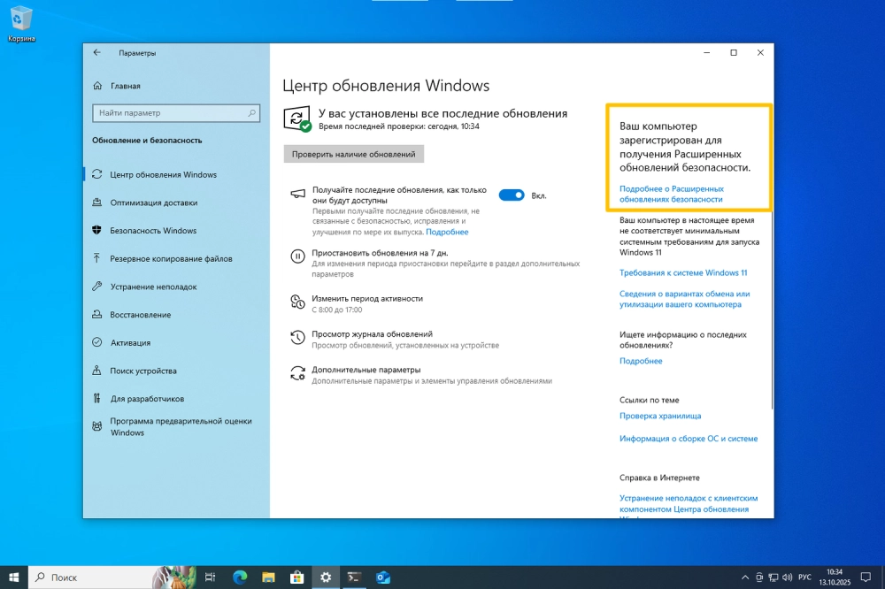 До 13 октября 2026 года обновления безопасности через «Центр обновления Windows», как и раньше.