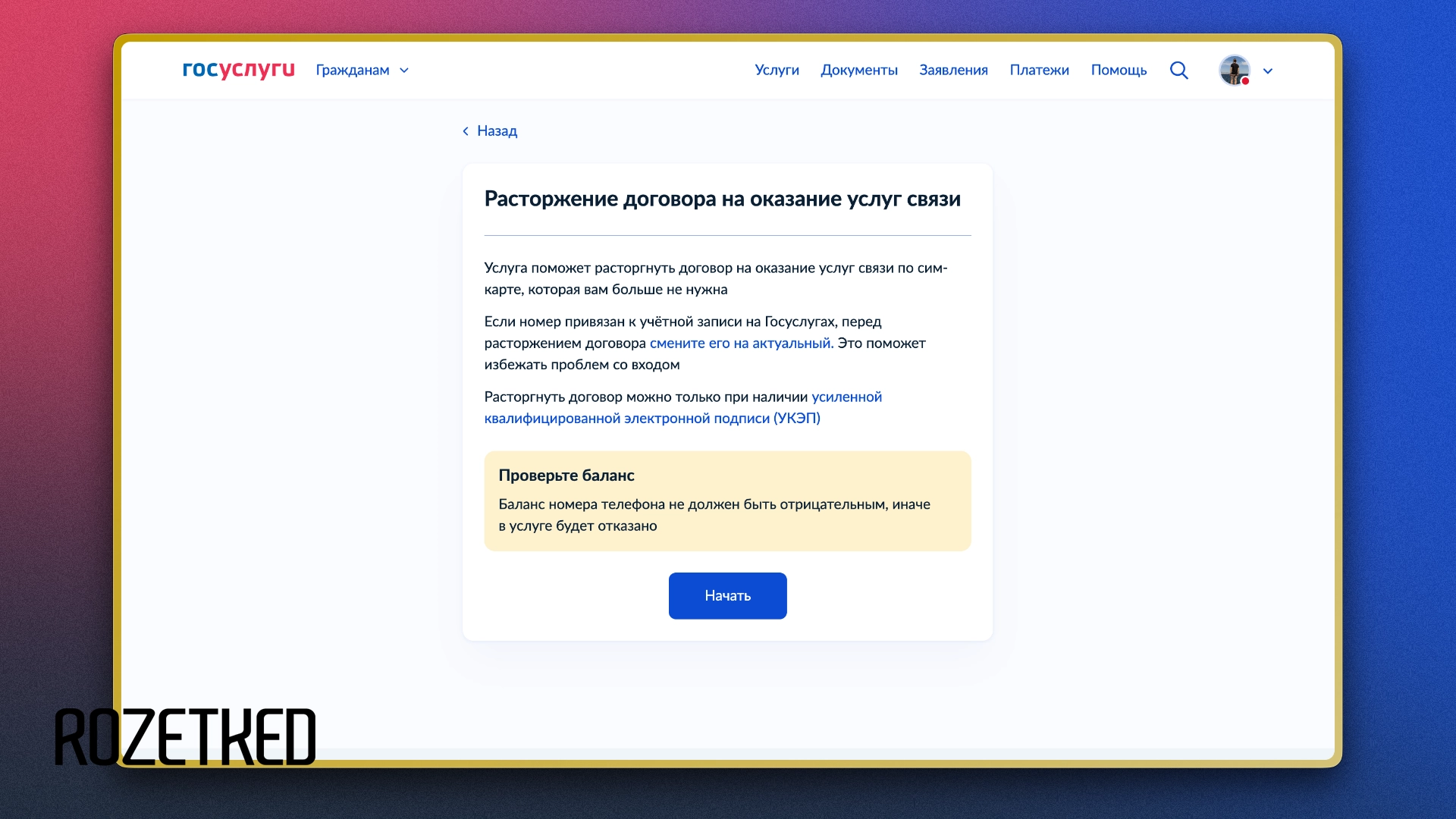 Сервис «Сим-карты» на «Госуслугах» позволяет удалённо расторгнуть договор на оказание услуг связи. Правда, для этого потребуется усиленная квалифицированная электронная подпись (УКЭП). Её можно оформить при визите в МФЦ или удалённо через приложение «Госключ» — правда, только если вы сдавали биометрию или владеете загранпаспортом нового образца (с чипом).