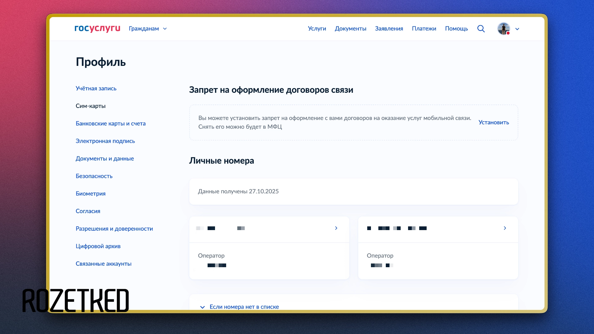- Откройте «Госуслуги» → «Профиль» → «Сим-карты».
