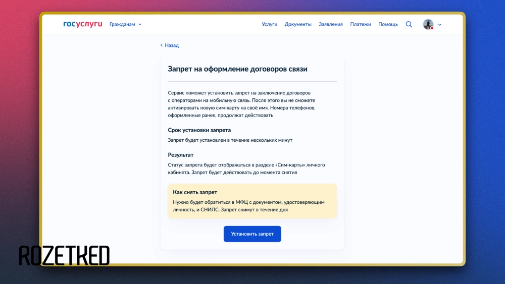 - В разделе «Запрет на оформление договоров связи» нажмите на кнопку «Установить».