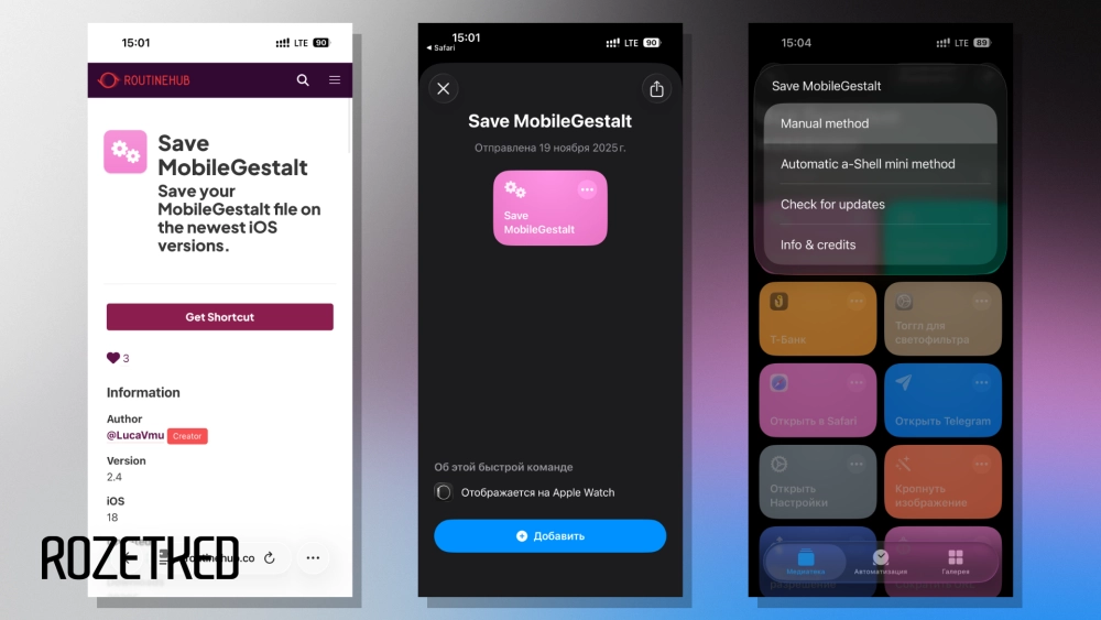 - На главной странице приложения «Команды» нажмите на ярлык Save MobileGestalt и выберите Manual method. Разрешите доступ на копирование контента, в следующем окне нажмите «ОК».