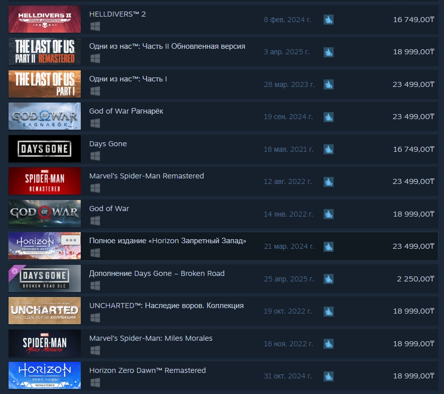 Среди игр, которые не вернулись в продажу: Horizon Zero Dawn Complete Edition, Until Dawn, LEGO Horizon Adventures и Ghost of Tsushima.