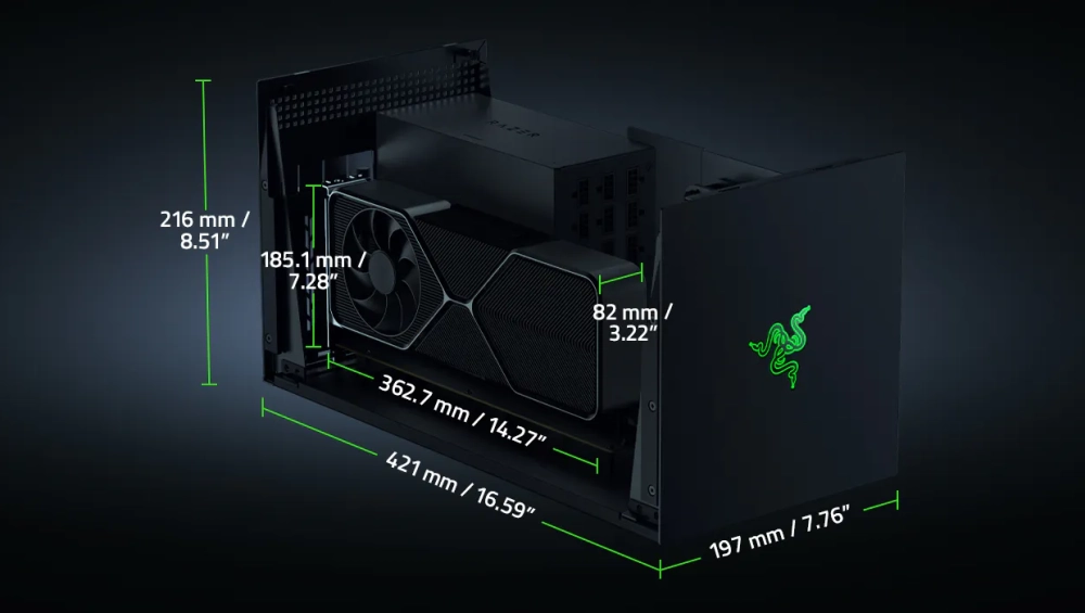 Устройство поддерживает новомодный интерфейс Thunderbolt 5 и позволяет ставить внутрь 4-слотовые видеокарты, то есть места хватит даже для массивных флагманских решений. Правда, карточка будет работать в режиме PCIe 4.0 x4, а это значит, что потеря производительности в сравнении с обычным десктопом неизбежна.