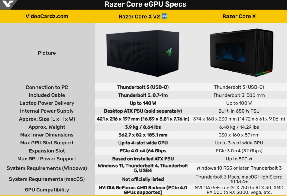 От Razer Core X V2 можно подать питание на подключенный ноутбук — до 140 Вт. Кабель Thunderbolt 5 входит в комплект поставки, а вот блок питания для видеокарты (и её саму) придётся докупать отдельно. Поддерживаются БП формата ATX.