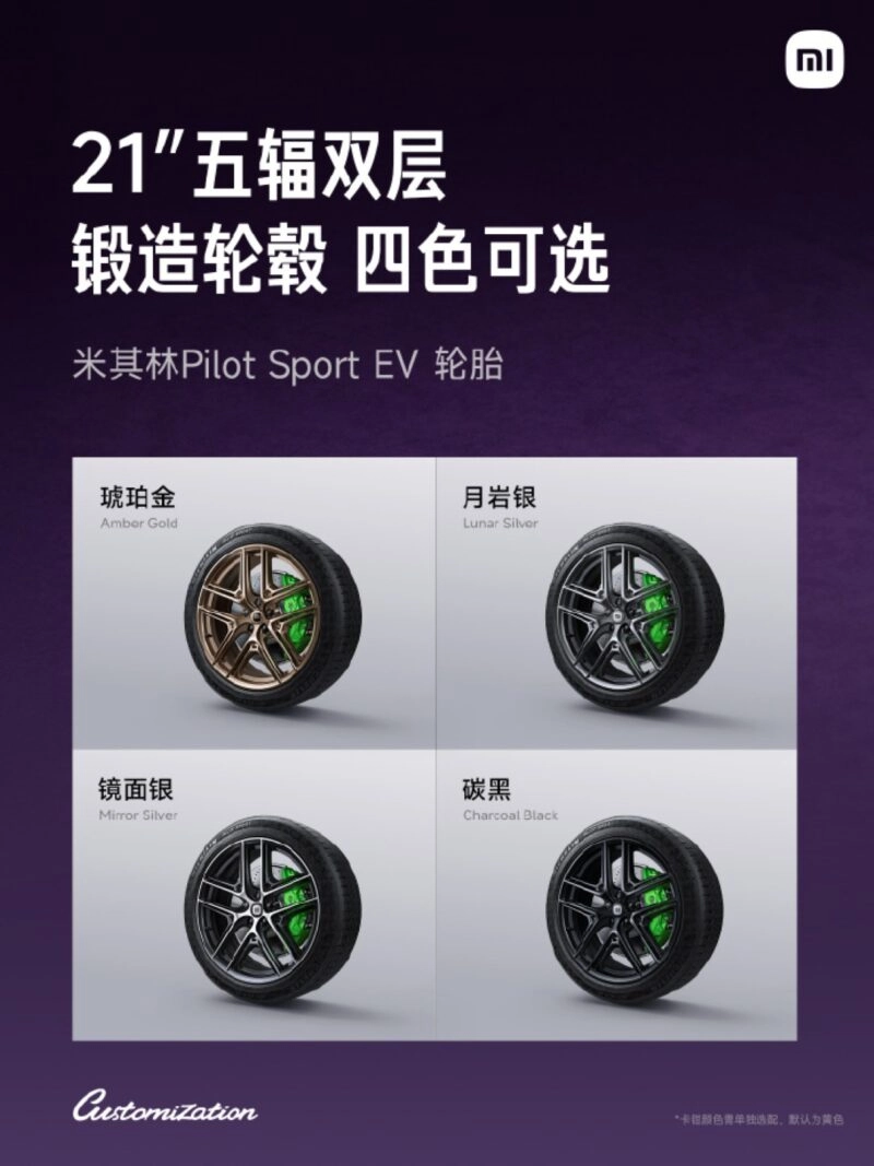 Первый набор включает пять новых цветов: Amethyst Purple, Racing Red, Sprout Yellow, Twilight Rose и Flowing Gold Pink Matte. В дальнейшем палитру планируют расширить до 100 оттенков. Кроме окраски, доступен выбор дизайна дисков, цветов тормозных суппортов и шильдика «Mi» — от карбона до варианта из 24-каратного золота с керамической оправой.