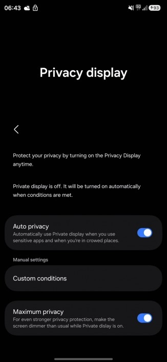Пользователь в X поделился скриншотами функции Privacy Display, которая, предположительно, будет затемнять экран так, чтобы посторонние люди с разных углов не могли видеть содержание дисплея. Функция появилась в сборке OneUI 8.5.