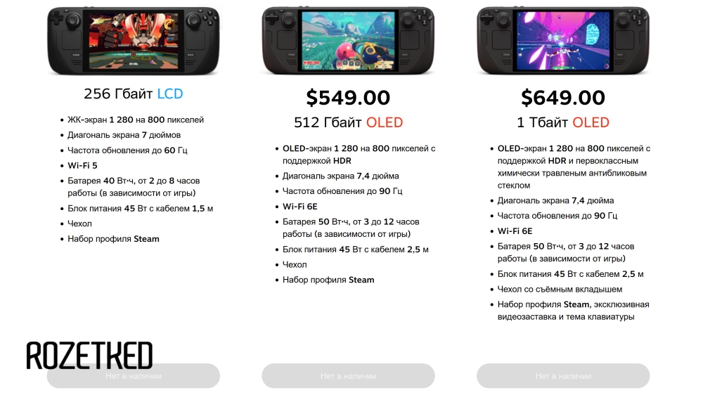 Все три консоли, включая топовые OLED-версии, отображаются с пометкой «нет в наличии». При этом Valve не делала официальных анонсов по поводу доступности консоли и ранее заверяла, что не планирует в ближайшее время выпускать следующее поколение.