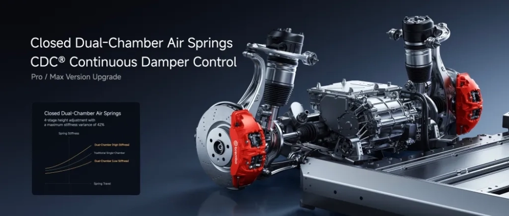 - Шасси и тормоза. Новое шасси Jiaolong дополнено амортизаторами CDC и двухкамерной пневмоподвеской (в версиях Pro и Max). Заявлена высокая выносливость тормозной системы — до 40 экстренных торможений подряд без потери эффективности.