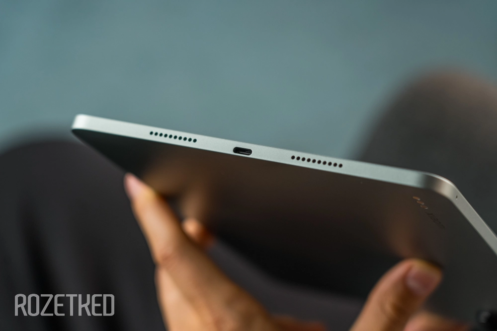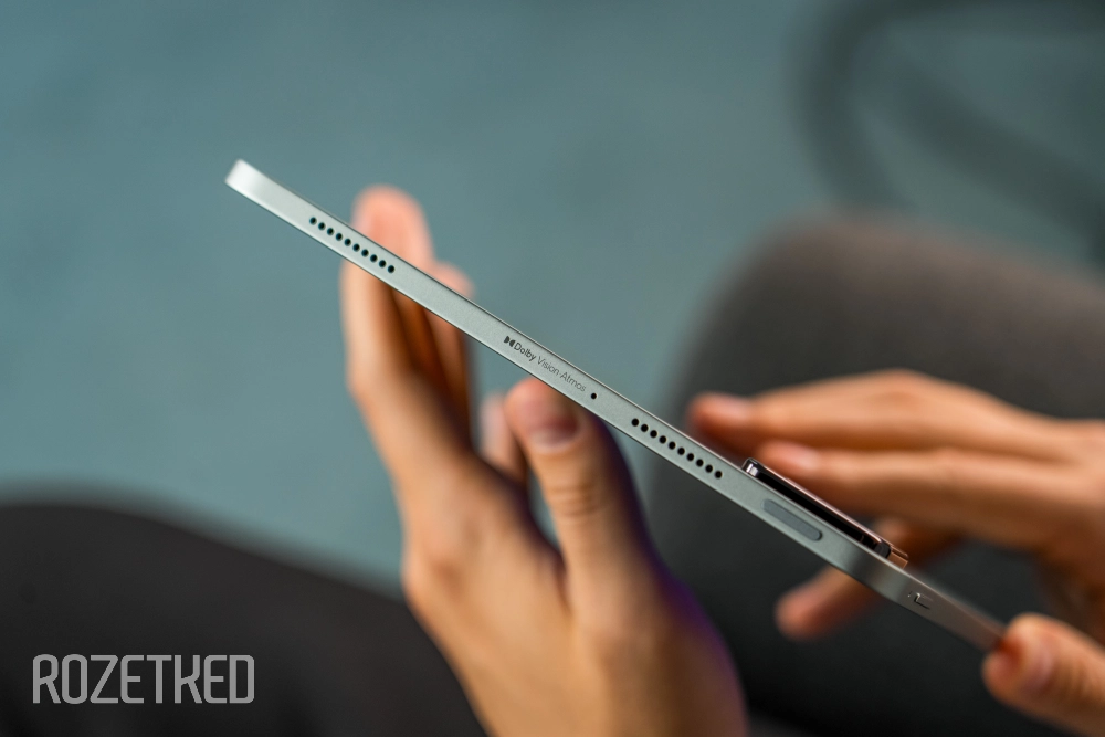Все элементы на корпусе размещены в привычном порядке: на торцах решётки 4х стереодинамиков, порт USB C и клавиша питания/блокировки. Есть датчик отпечатков пальцев и поддержка работы со стилусом.